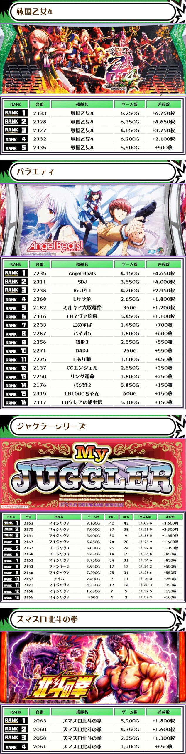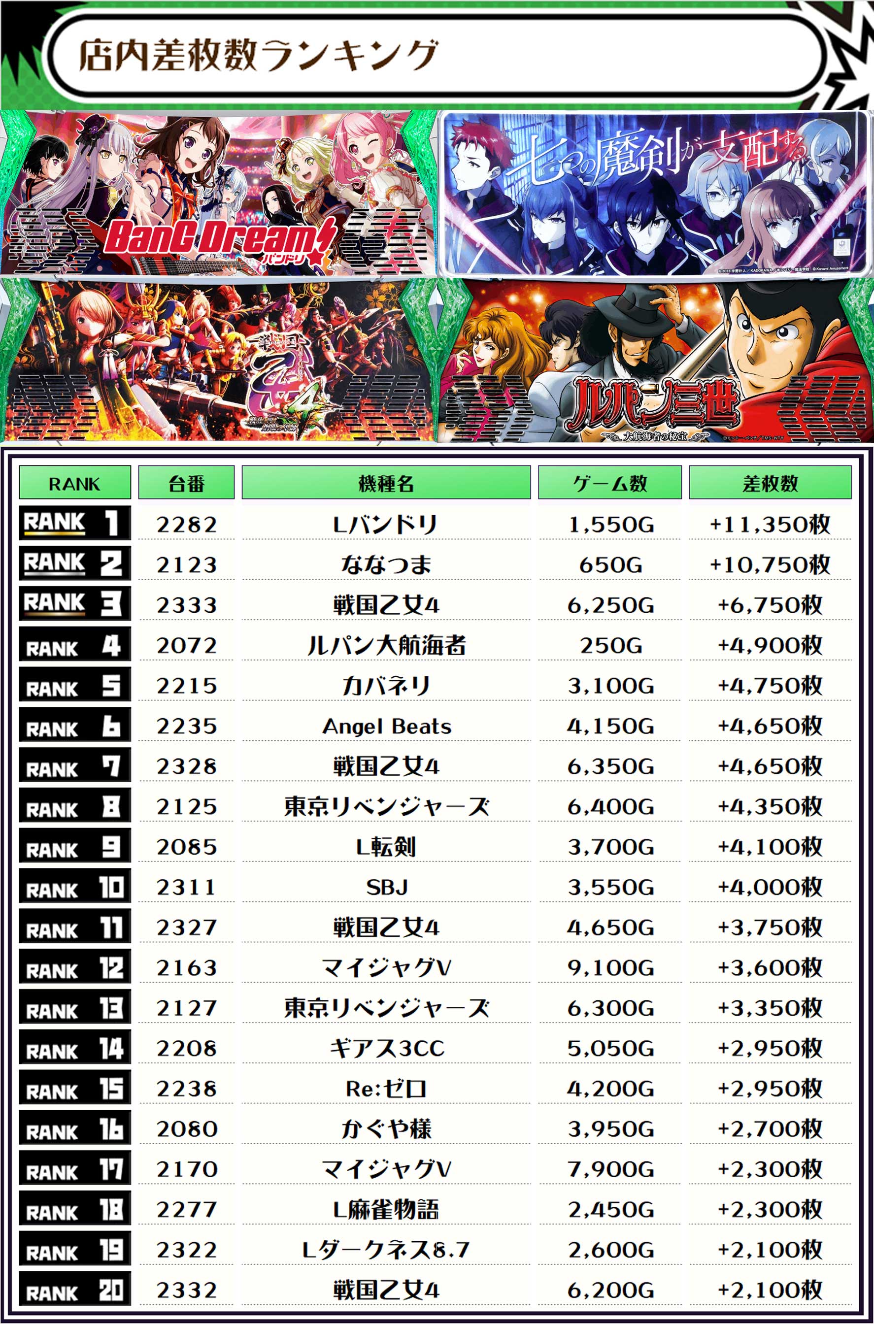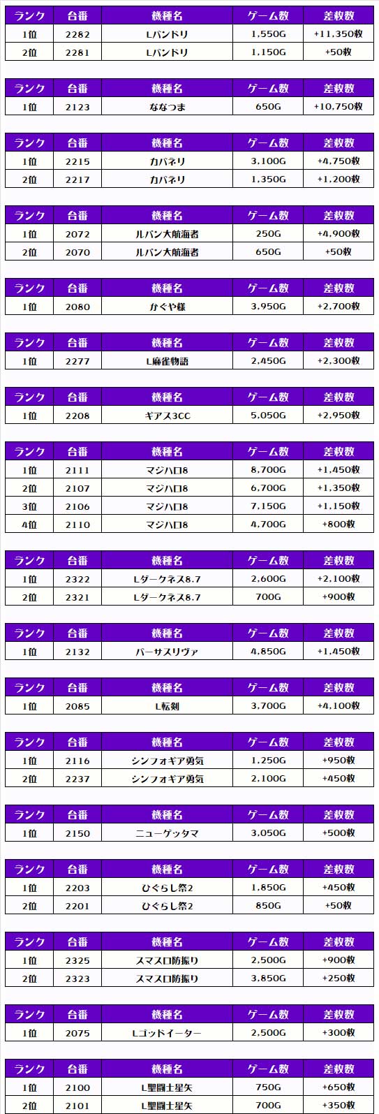 ということで、この日の店舗全体差枚数ランキングがこちら!!