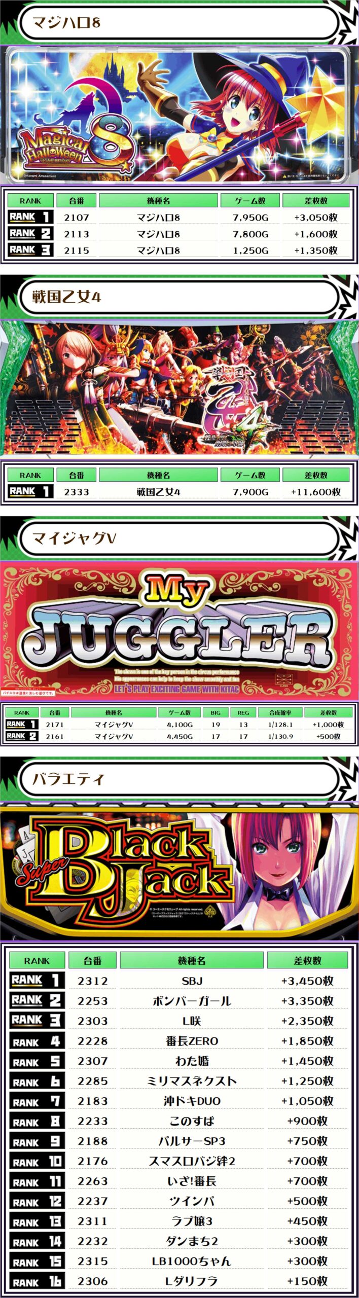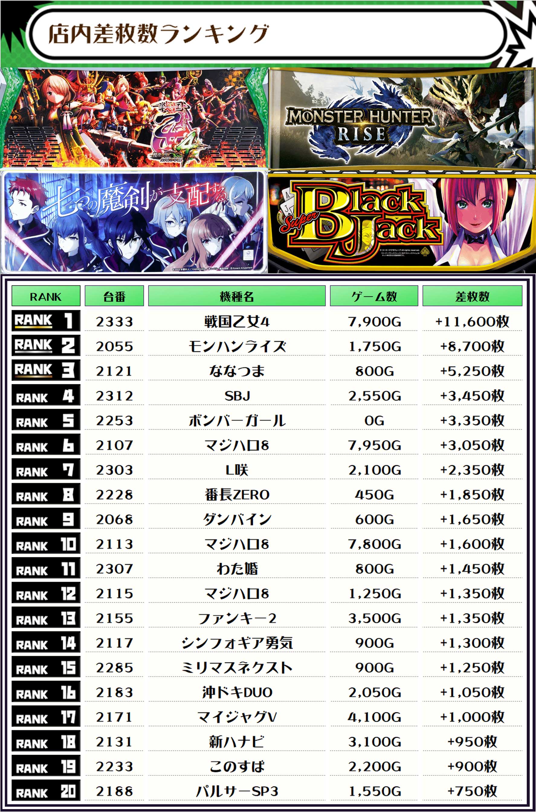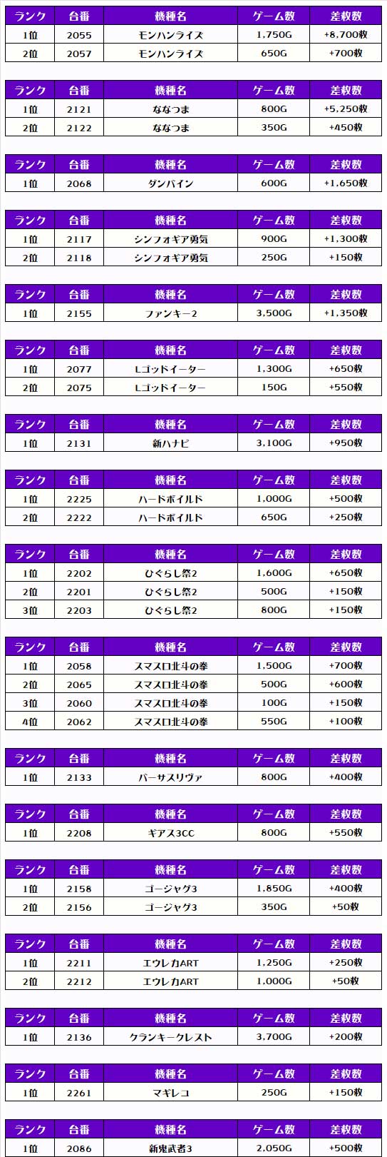 ということで、この日の店舗全体差枚数ランキングがこちら!!