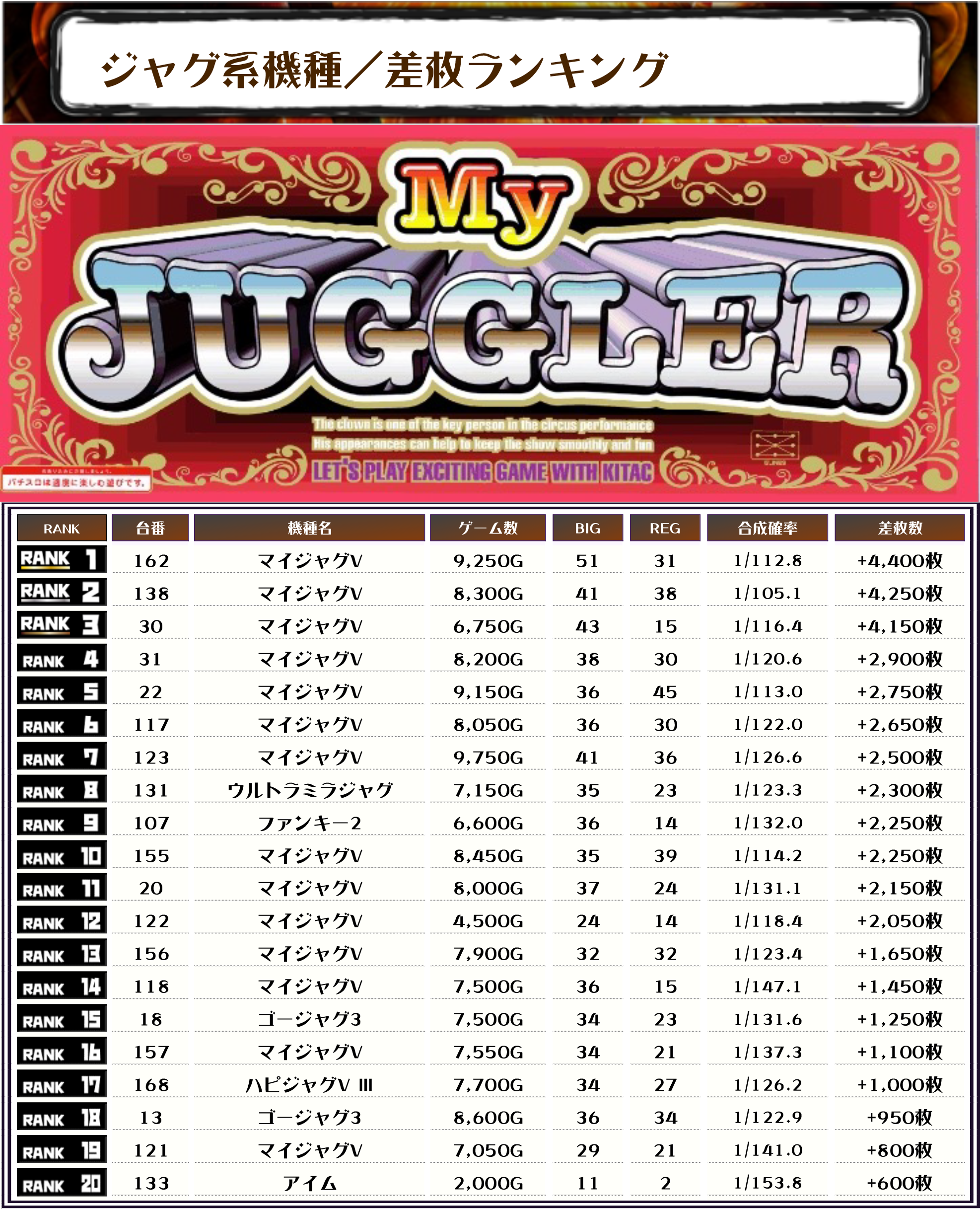 ズラリとマイジャグVが並ぶランキングとなりました‼️