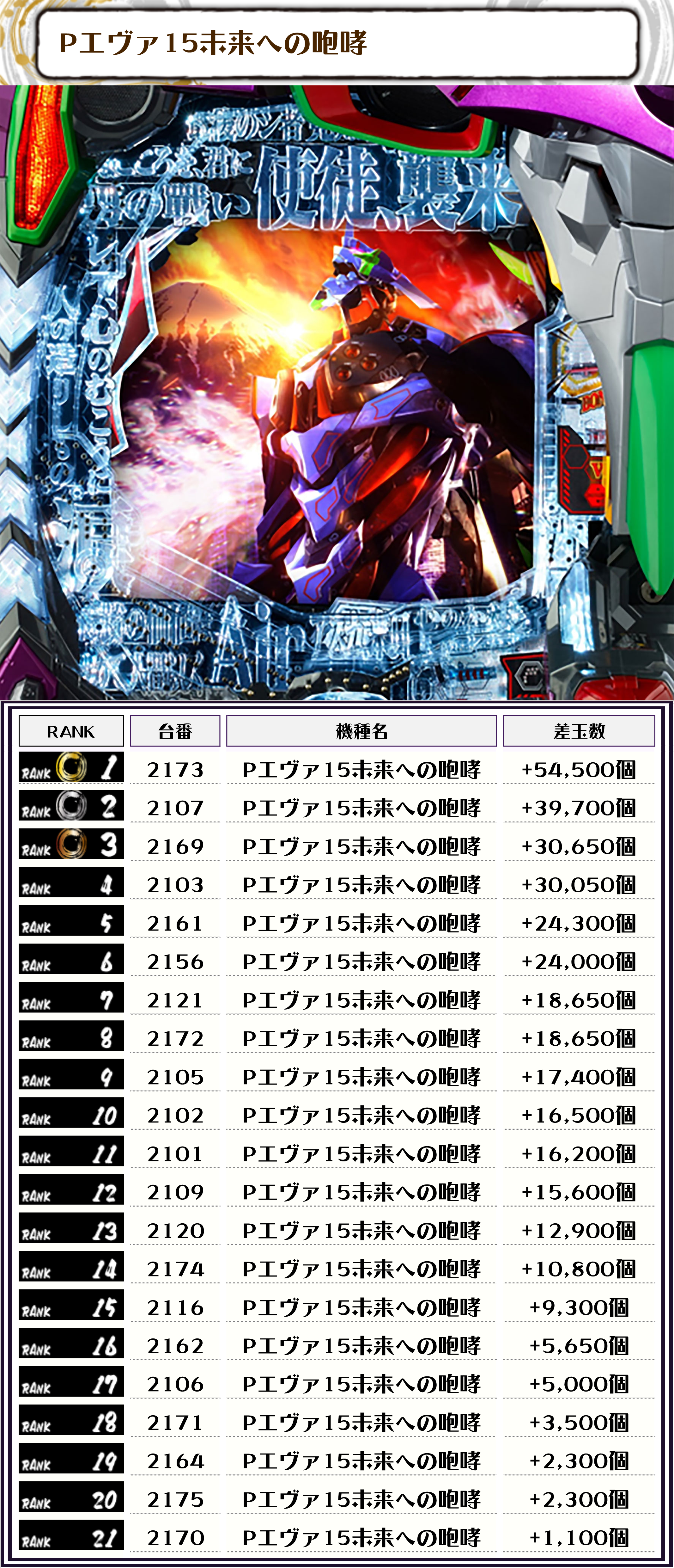 また、2位にはPエヴァ15未来への咆哮1178番台】+17,600発、3位にはPエヴァ15未来への咆哮・1171番台】の+16,950発がランクインしました🏆