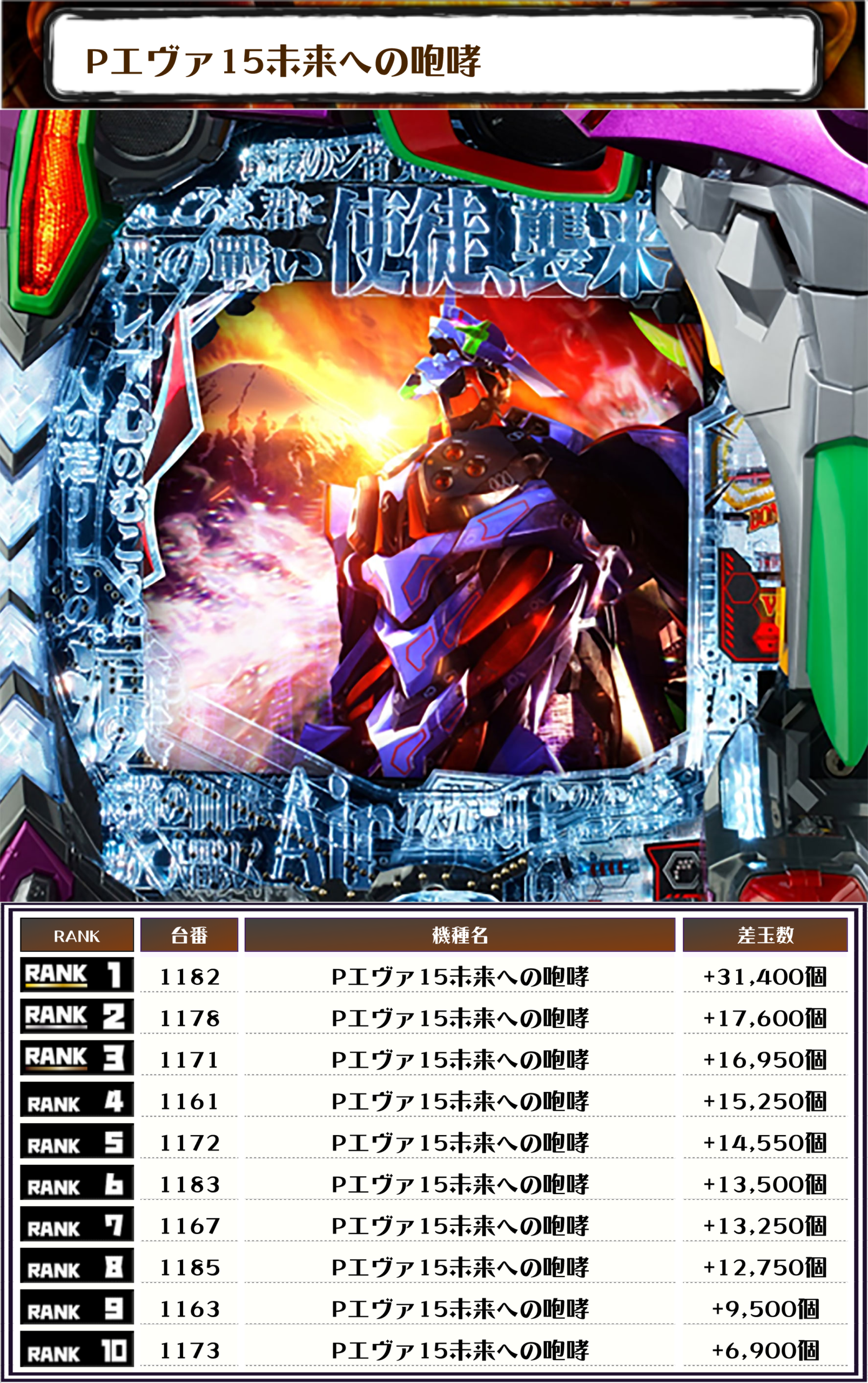 また、2位にはPエヴァ15未来への咆哮1178番台】+17,600発、3位にはPエヴァ15未来への咆哮・1171番台】の+16,950発がランクインしました🏆