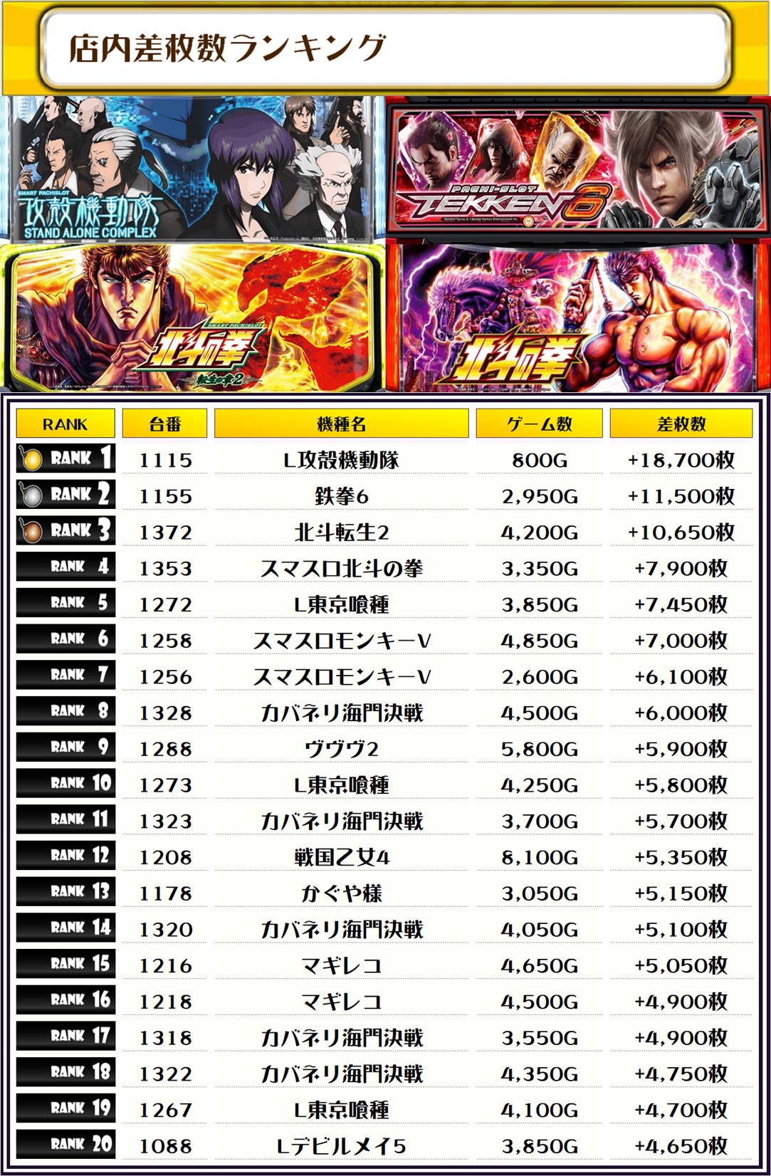 続く2位には【鉄拳6・1155番台】の+11,500枚、そして3位には【北斗転生2・1372番台】の+10,650枚がランクインっ🏆🏆🏆🏆
