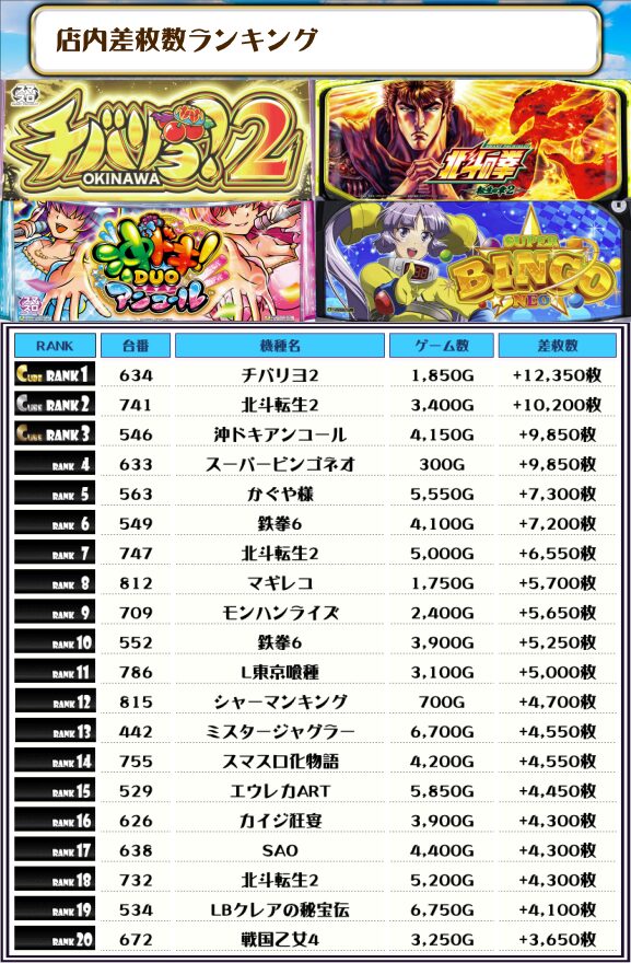 2位には【北斗転生2・741番台】の+10,200枚、そして3位には【沖ドキアンコール・546番台】の+9,850枚がランクインっ🏆🏆🏆🏆