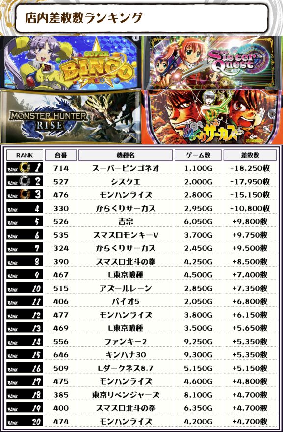 2位には【シスクエ・527番台】の+17,950枚、そして3位には【モンハンライズ・476番台】の+15,150枚がランクインっ🏆🏆🏆🏆