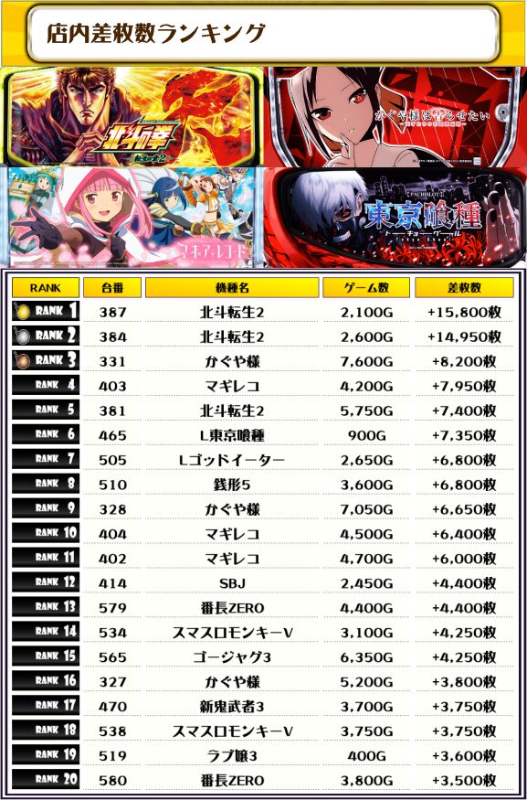 2位には【北斗転生2・384番台】の+14,950枚、3位には【かぐや様・331番台】の+8,200枚がランクインじゃっ❗️