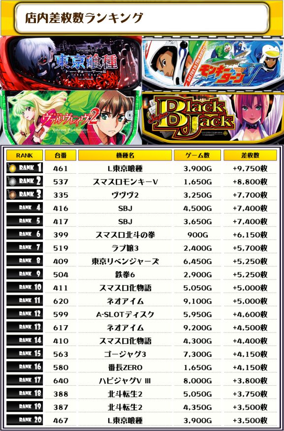 差枚ランキングでTOPに輝いたのは【L東京喰種・461番台】の+9,750枚‼️💥💥💥