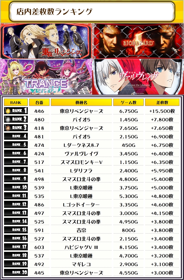 この日、全体のトップに輝いたのは【東京リベンジャーズ・446番台】で+15,500枚‼️