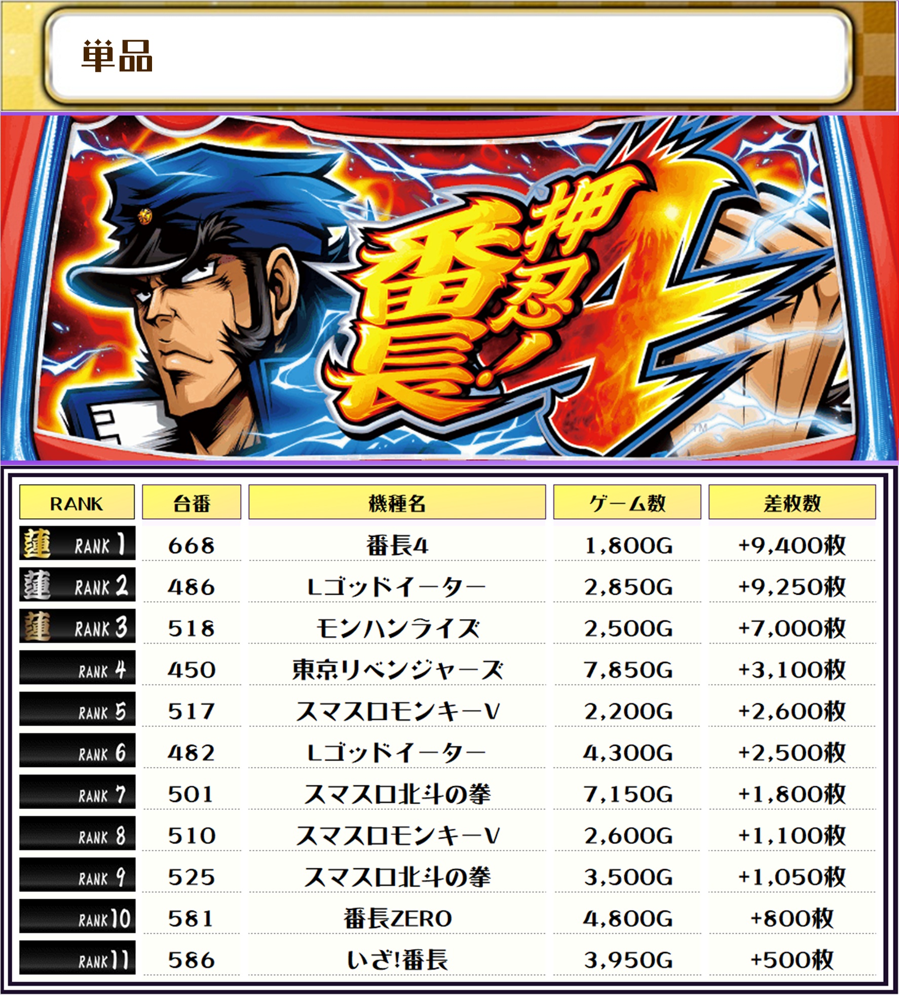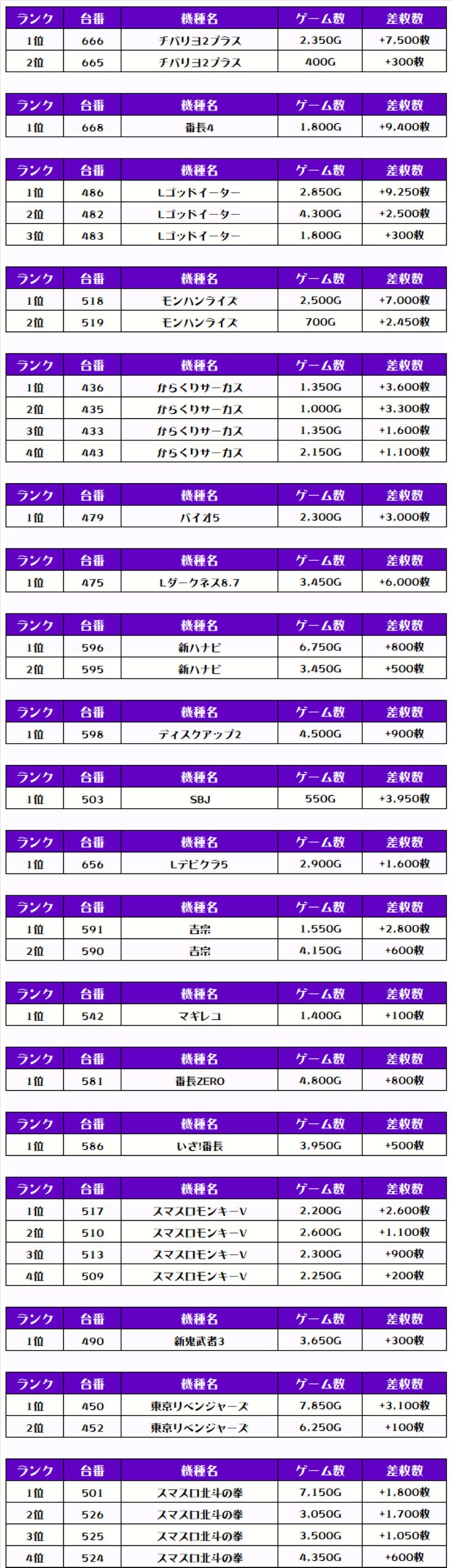 それではこの日の【機種別差枚ランキング】を見ていきましょう!