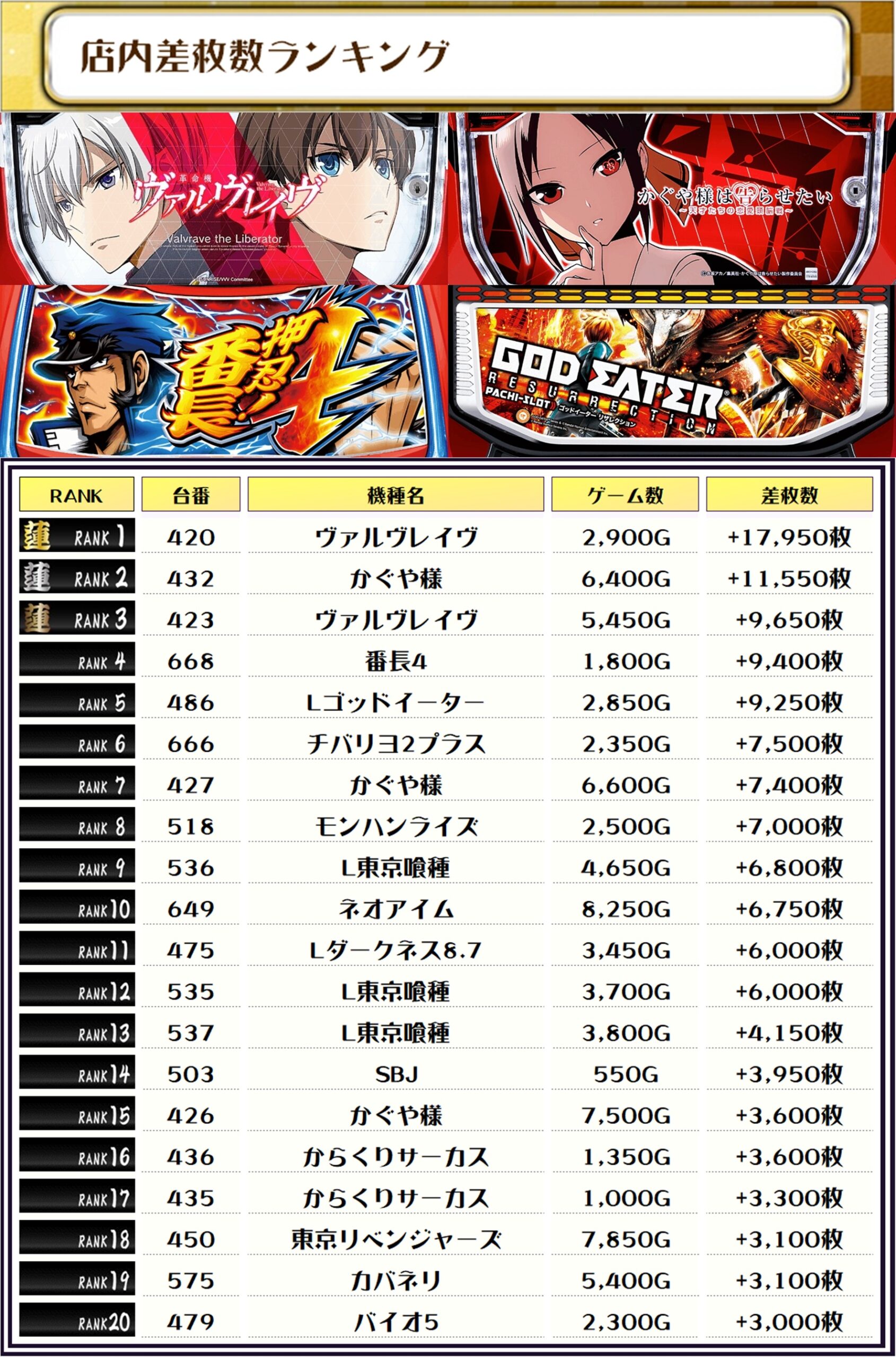 この日、全体のトップに輝いたのは【ヴァルヴレイヴ・420番台】で+17,950枚‼️