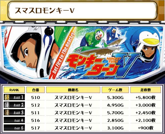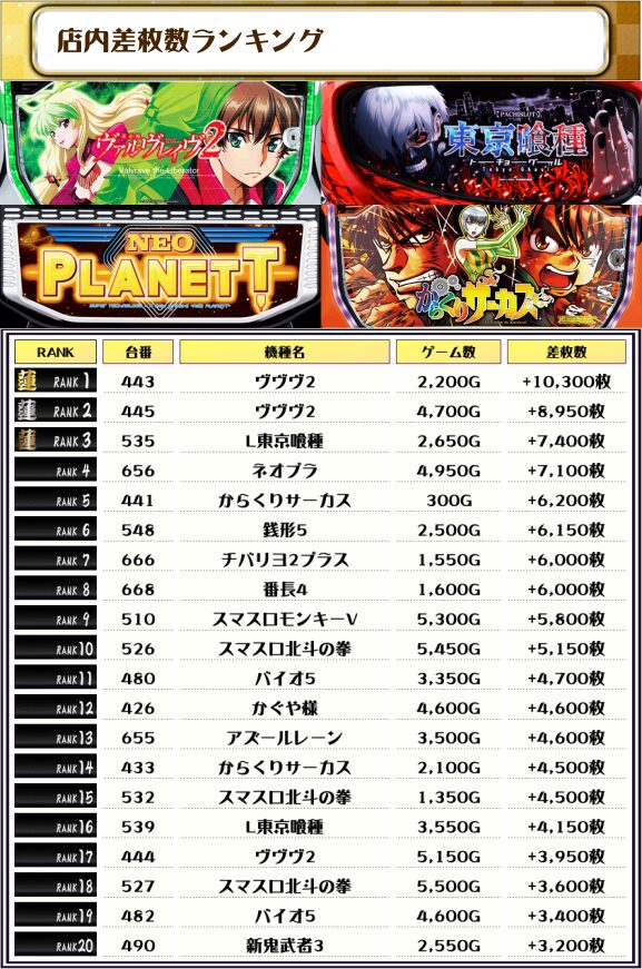 2位にも同じく【ヴヴヴ2・445番台】の+8,950枚、そして3位には【L東京喰種・535番台】の+7,400枚がランクインっ🏆🏆🏆🏆