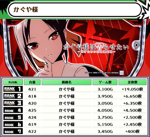 この日、全体のトップに輝いたのは【かぐや様・421番台】で+19,050枚‼️
