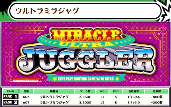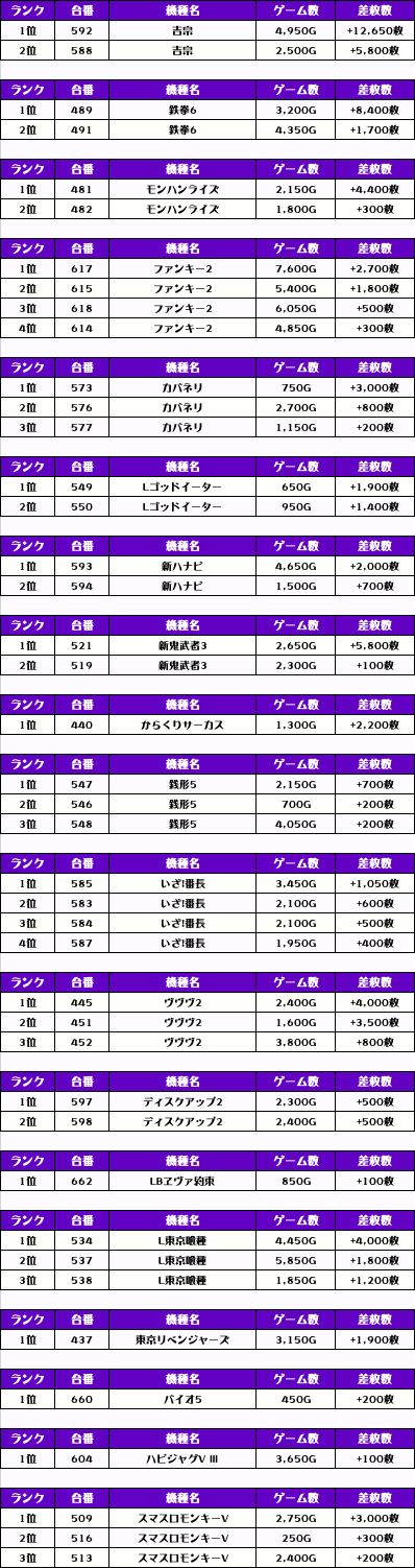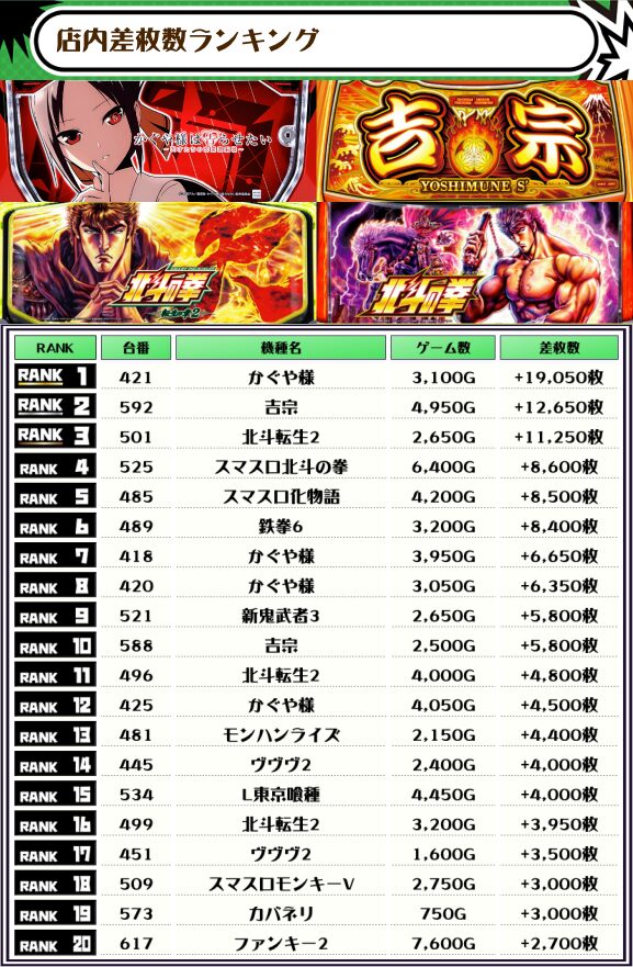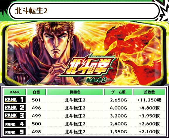 2位には【吉宗・592番台】の+12,650枚、そして3位には【北斗転生2・501番台】の+11,250枚がランクインっ🏆🏆🏆🏆
