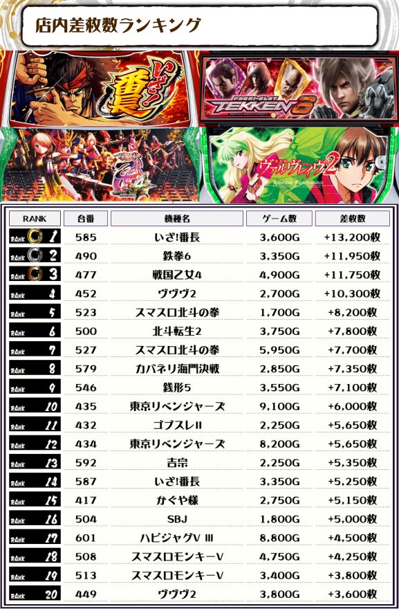 2位には【鉄拳6・490番台】の+11,950枚、そして3位には【戦国乙女4・477番台】の+8,400枚がランクインっ🏆🏆🏆
