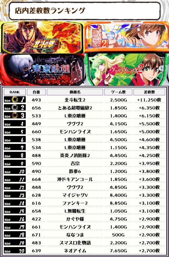 続く2位には【とある超電磁砲2・656番台】の+6,350枚、そして3位には【L東京喰種・533番台】の+6,150枚がランクインっ🏆🏆🏆🏆