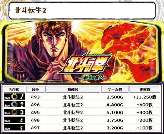 この日、全体の差枚トップに輝いたのは【北斗転生2・493番台】で+11,250枚‼️