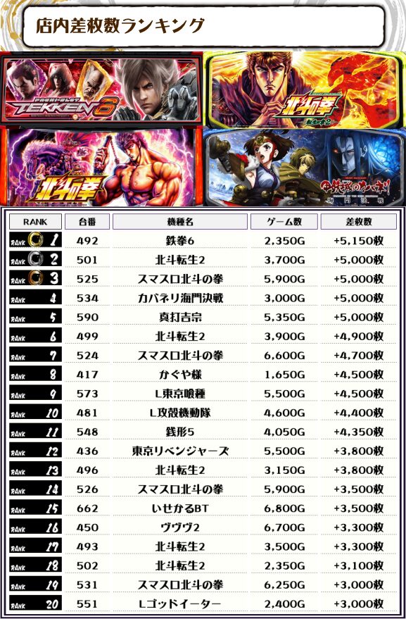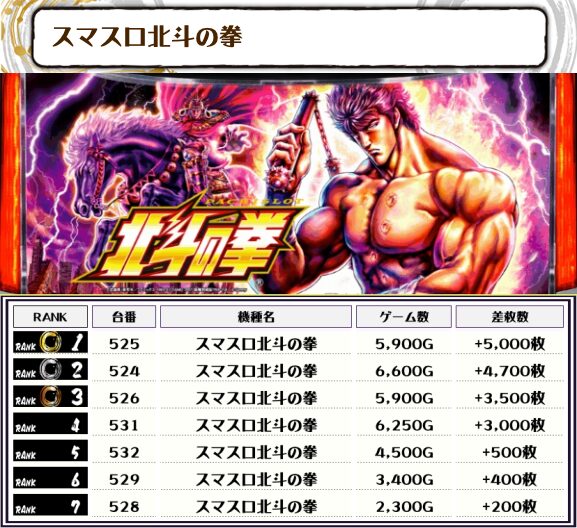 2位には【北斗転生2・501番台】の+5,000枚、そして3位には【スマスロ北斗の拳・525番台】の+5,000枚がランクインっ🏆🏆🏆
