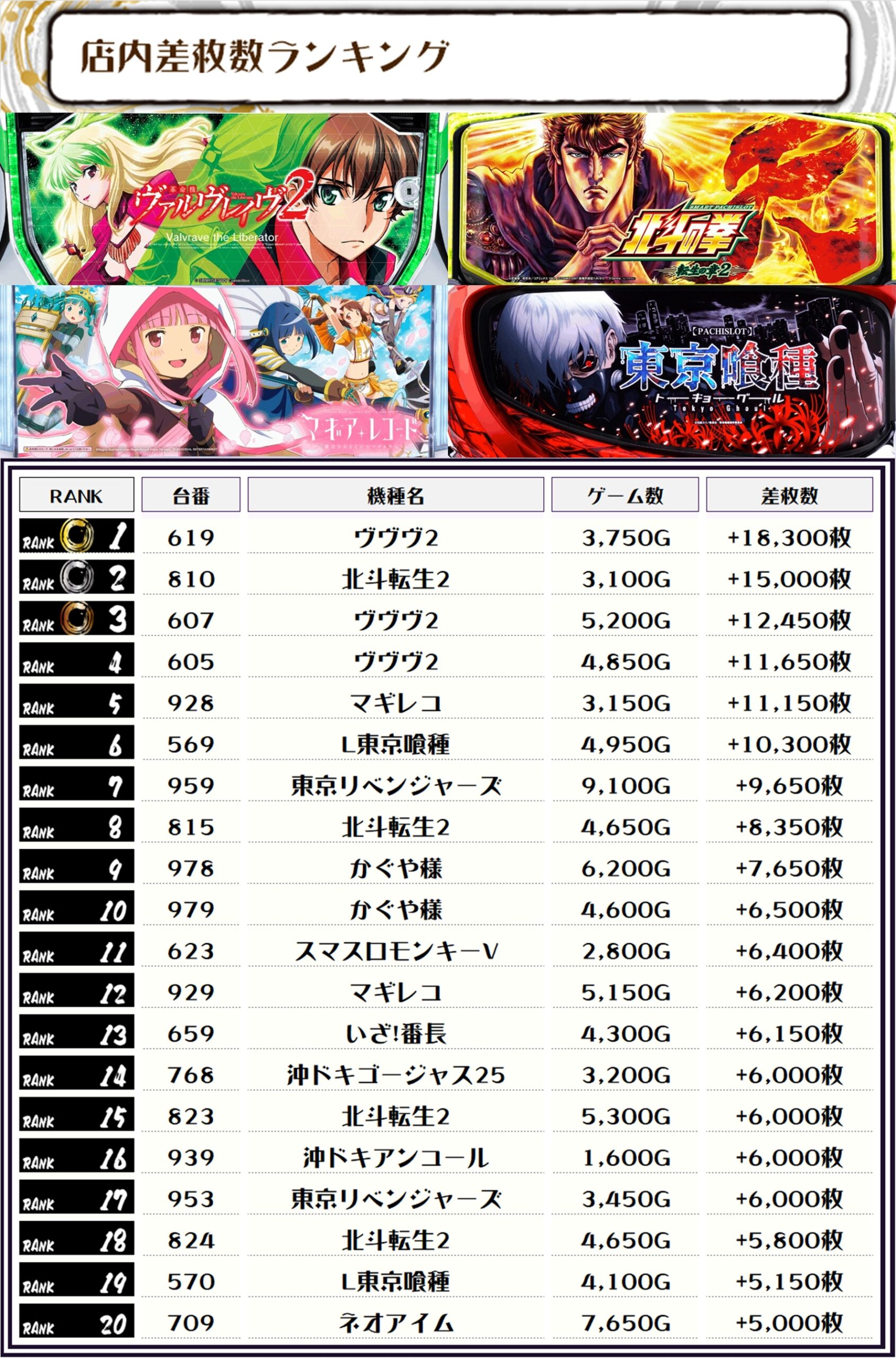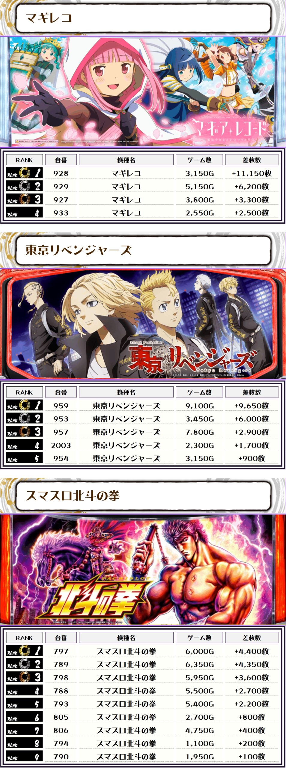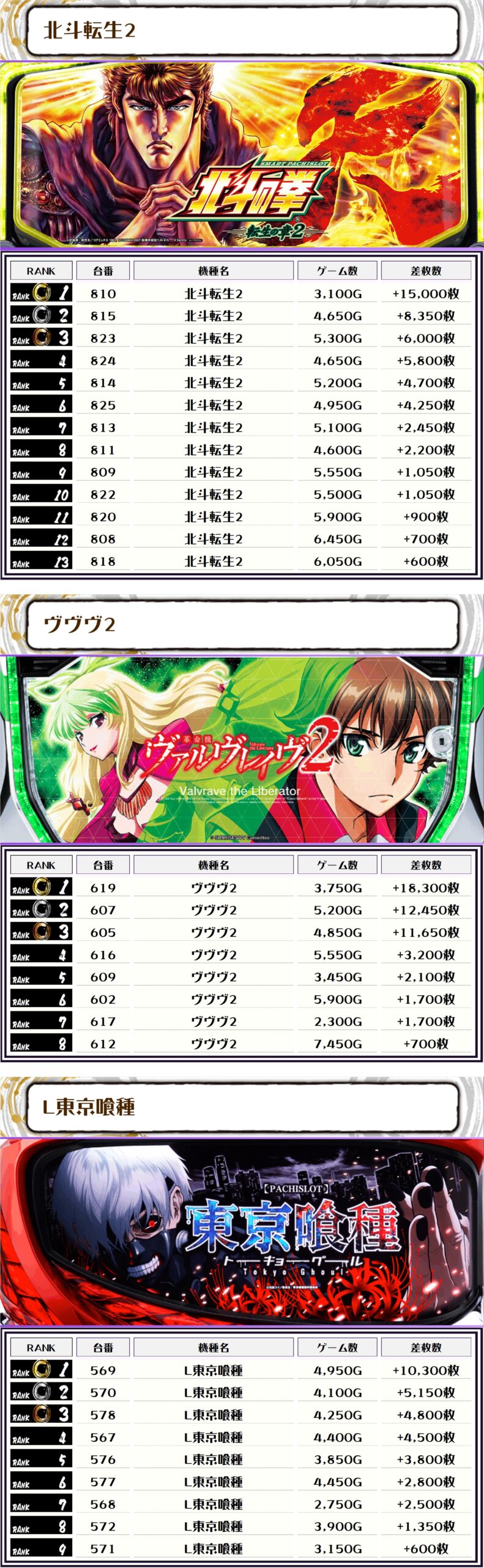 続く2位にも【北斗転生2・810番台】の+15,000枚、そして3位には【ヴヴヴ2・607番台】の+12,450枚がランクインっ🏆🏆🏆🏆
