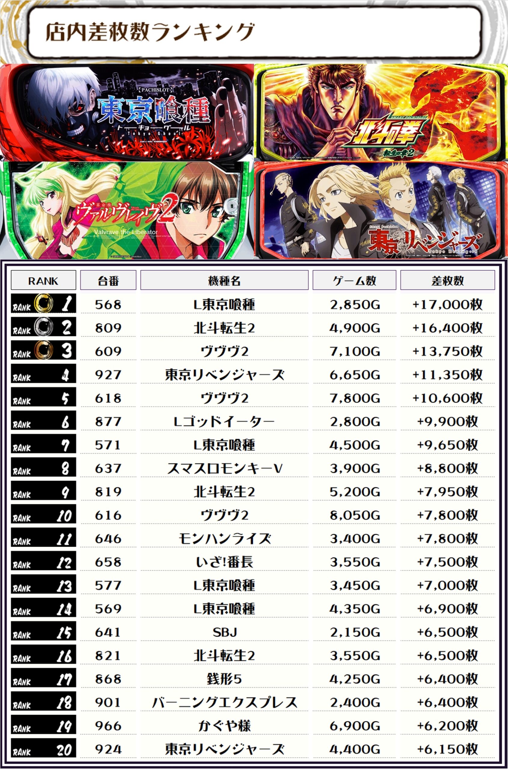 続く2位には【北斗転生2・809番台】の+16,400枚、そして3位には【ヴヴヴ2・609番台】の+13,750枚がランクインっ🏆🏆🏆🏆