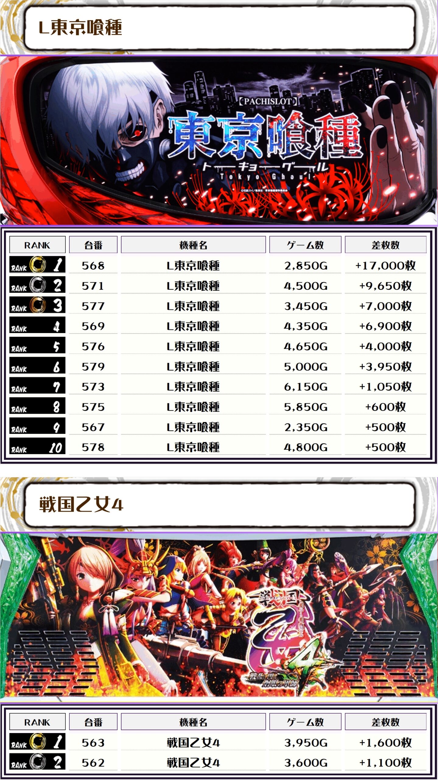 この日、全体の差枚トップに輝いたのは【L東京喰種・568番台】で+17,000枚‼️