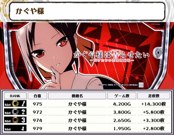 この日、全体の差枚トップに輝いたのは【かぐや様・975番台】で+14,300枚‼️