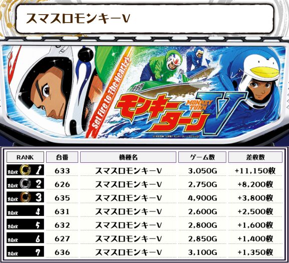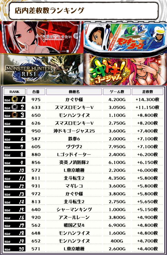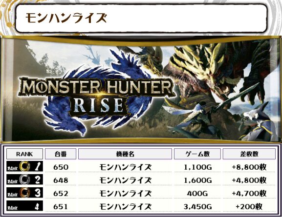 続く2位にも【スマスロモンキーV・633番台】の+11,150枚、そして3位には【モンハンライズ・650番台】の+8,800枚がランクインっ🏆🏆🏆🏆