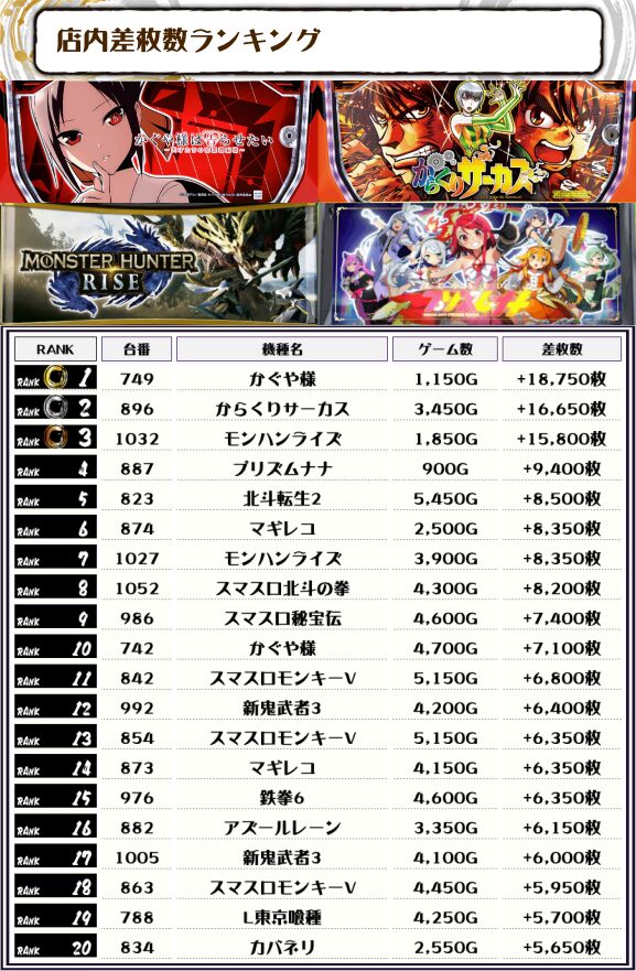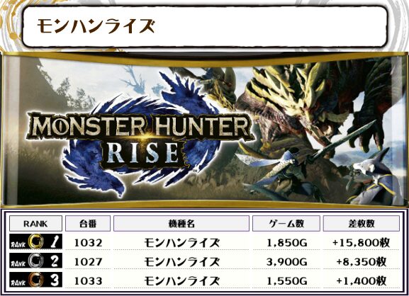 続く2位には【からくりサーカス・896番台】の+16,650枚、そして3位には【モンハンライズ・1032番台】の+15,800枚がランクインっ🏆🏆🏆🏆
