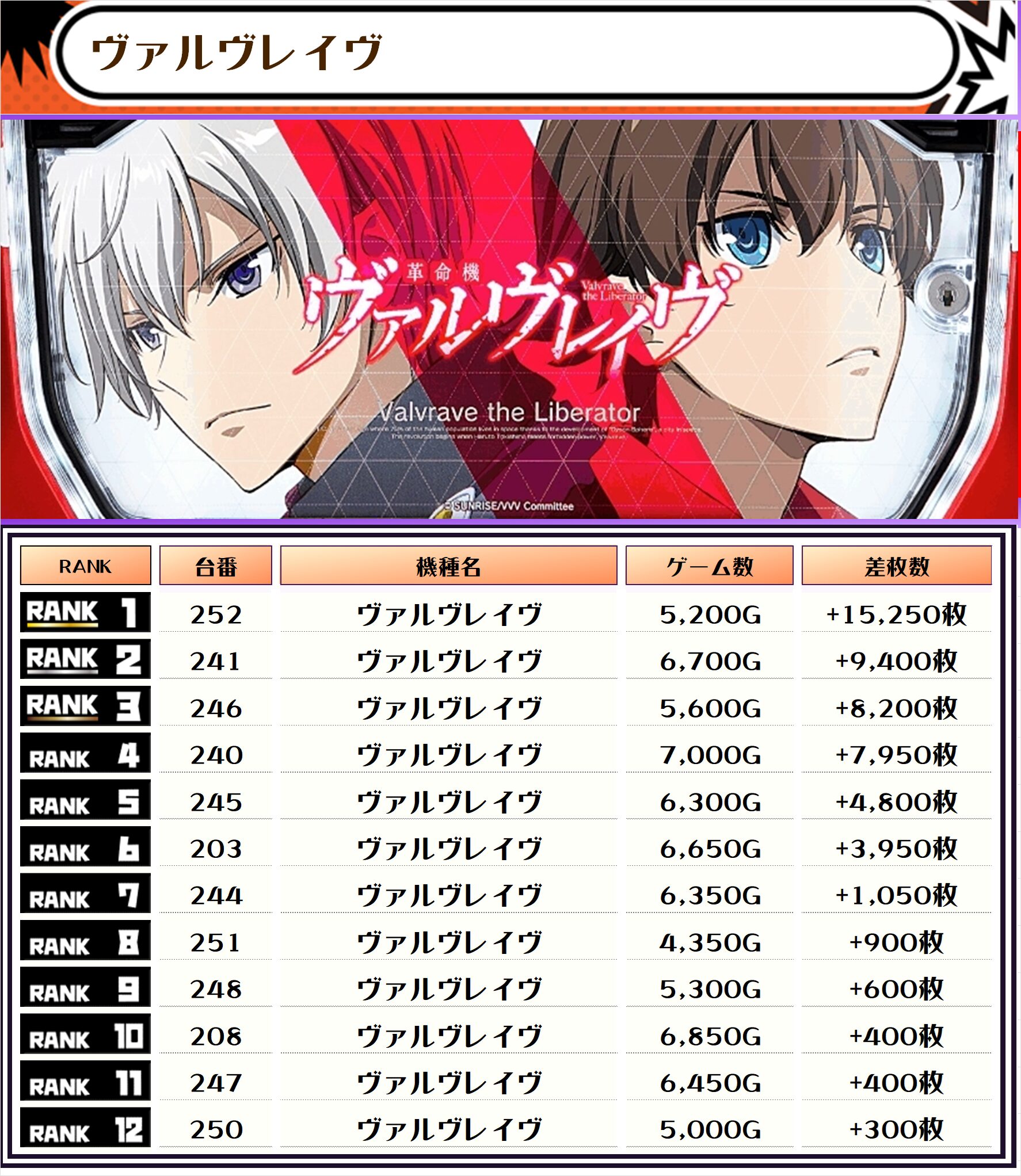 2位には【からくりサーカス・233番台】の+15,600枚、3位には【ヴァルヴレイヴ・252番台】の15,250枚がランクインっ🏆🏆🏆🏆