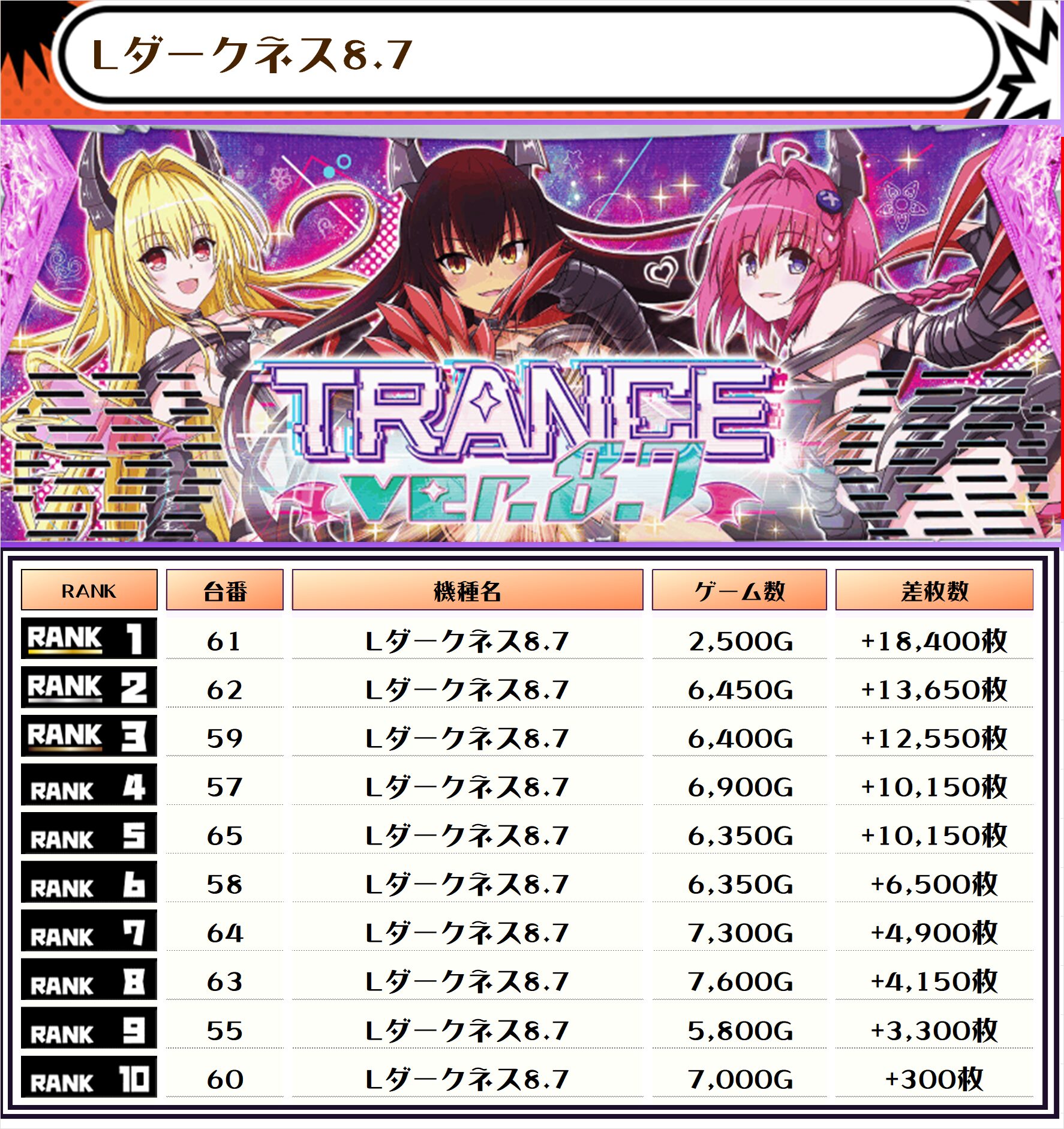この日、全体の差枚トップに輝いたのは【Lダークネス8.7・61番台】の+18,400枚‼️
