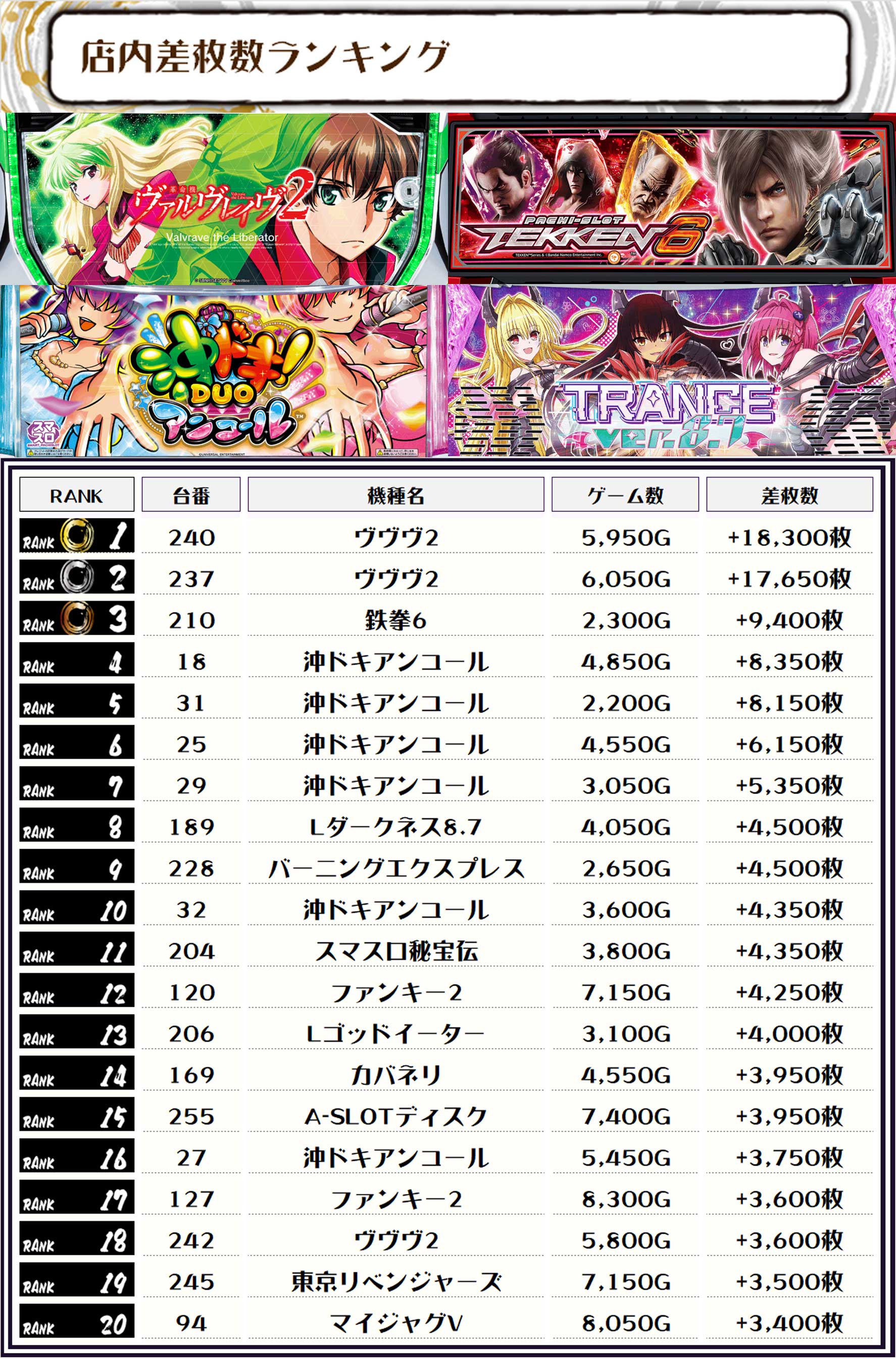 差枚ランキングでTOPに輝いたのは【ヴヴヴ2・240番台】で+18,300枚‼️