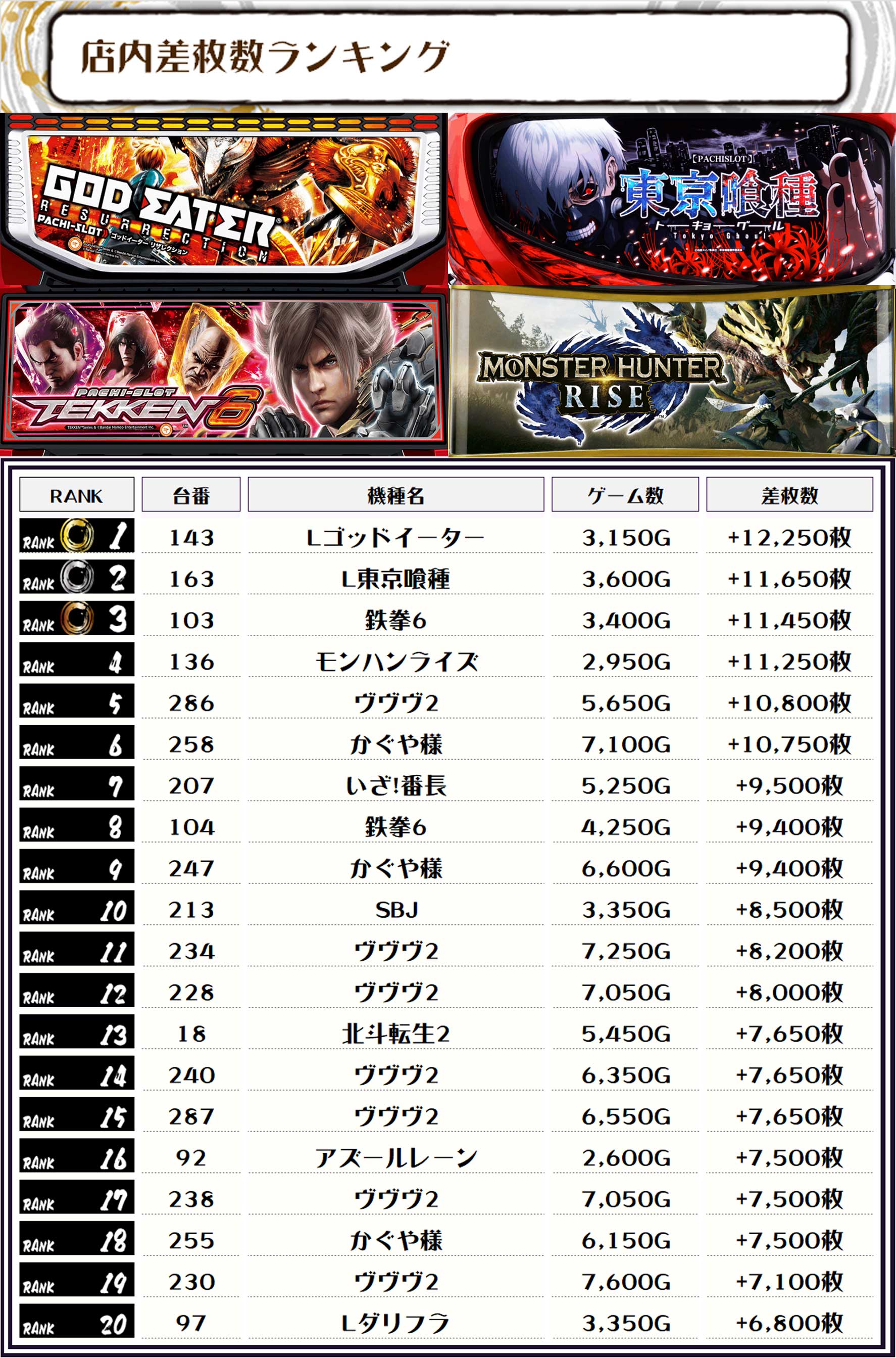 差枚ランキングでTOPに輝いたのは【Lゴッドイーター・143番台】で+12,250枚‼️