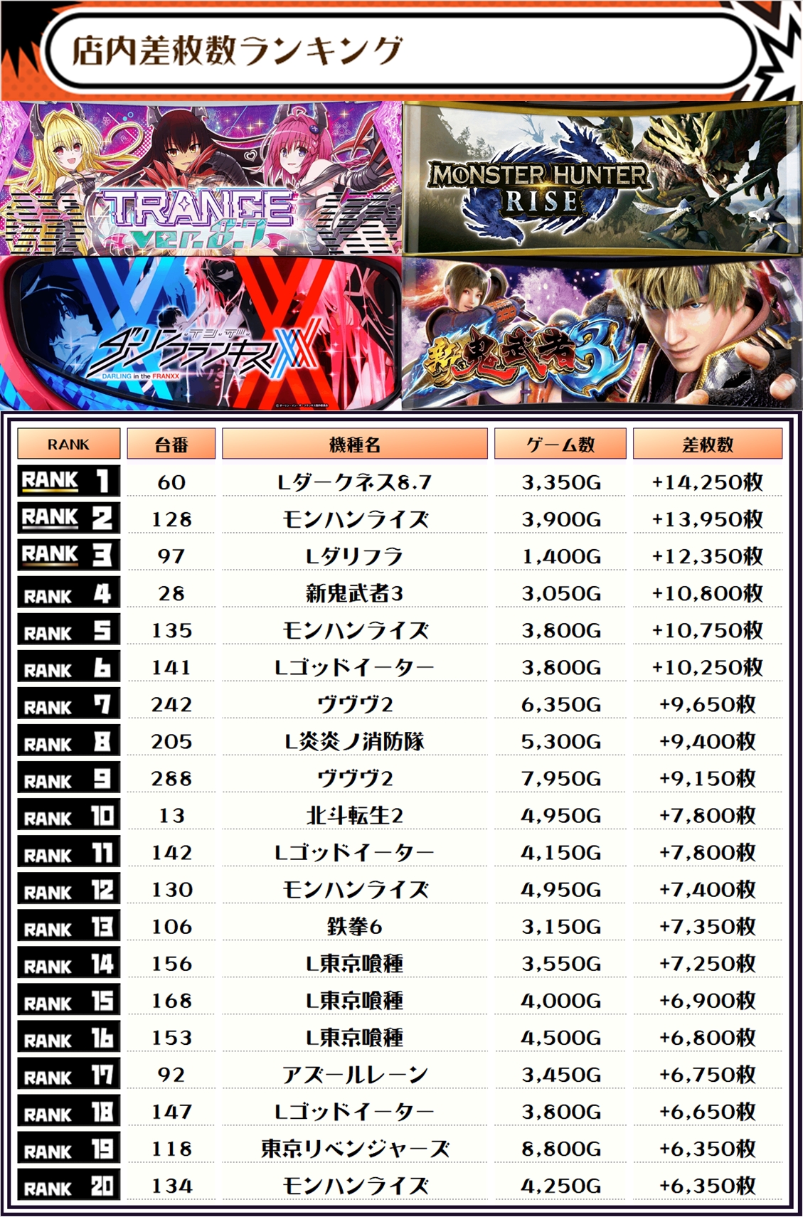 2位には【モンハンライズ・128番台】の+13,950枚、そして3位には【Lダリフラ・97番台】の+12,350枚がランクインしましたっ👾👾👾