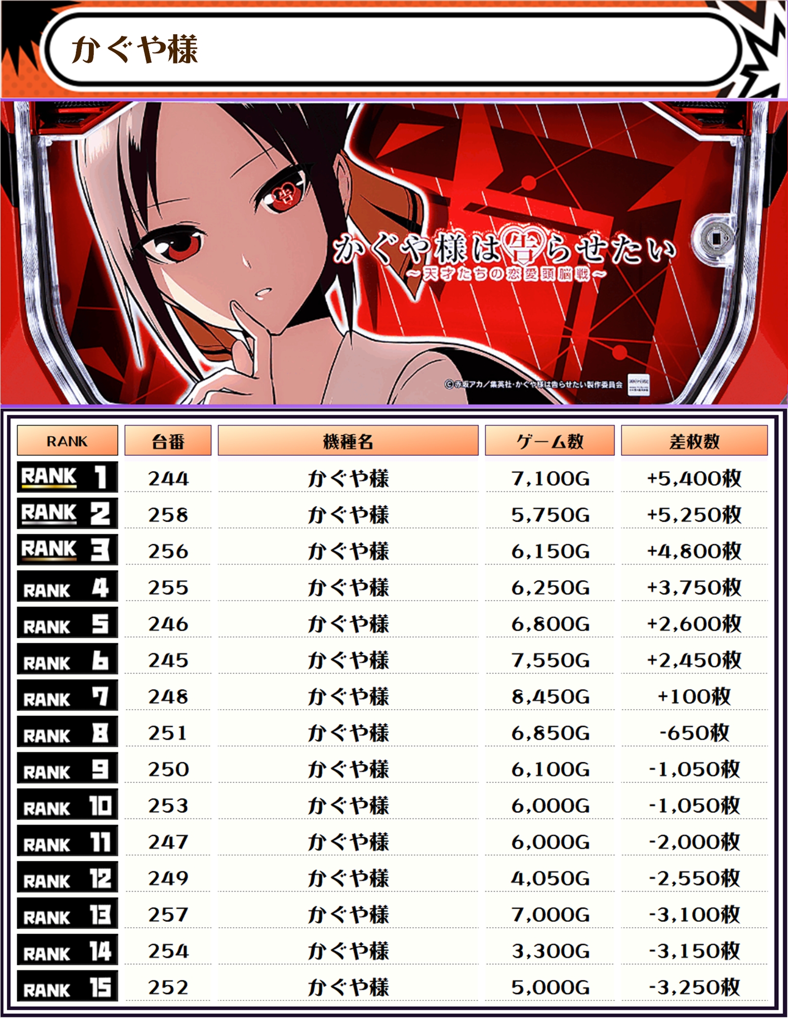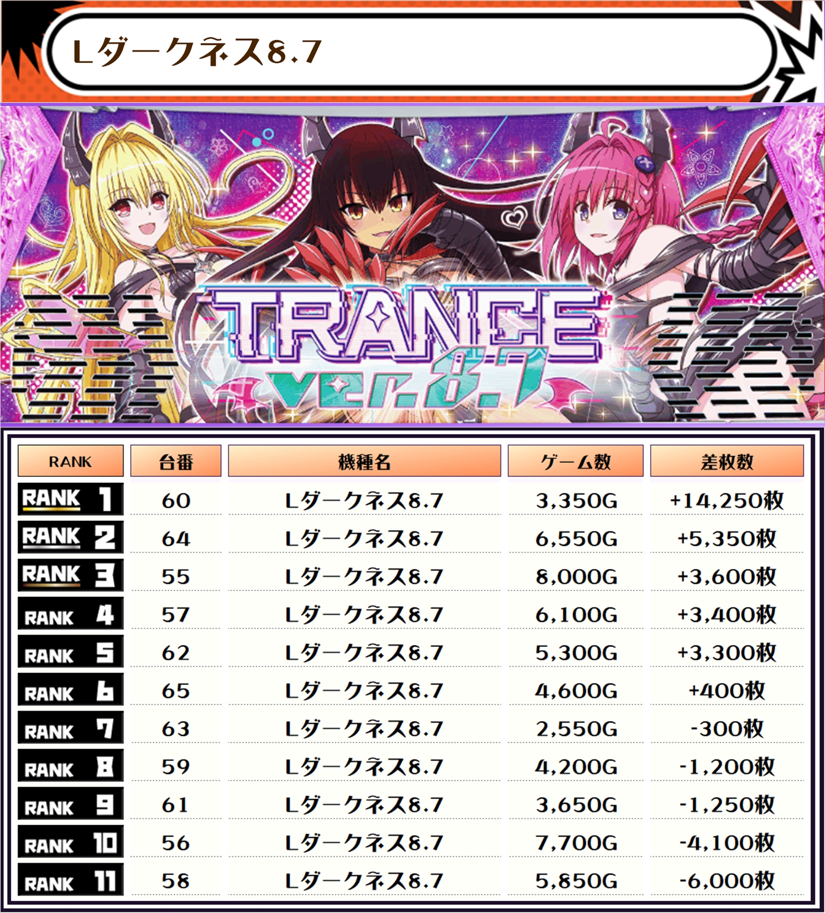 差枚ランキングでTOPに輝いたのは【Lダークネス8.7・60番台】で+14,250枚‼️