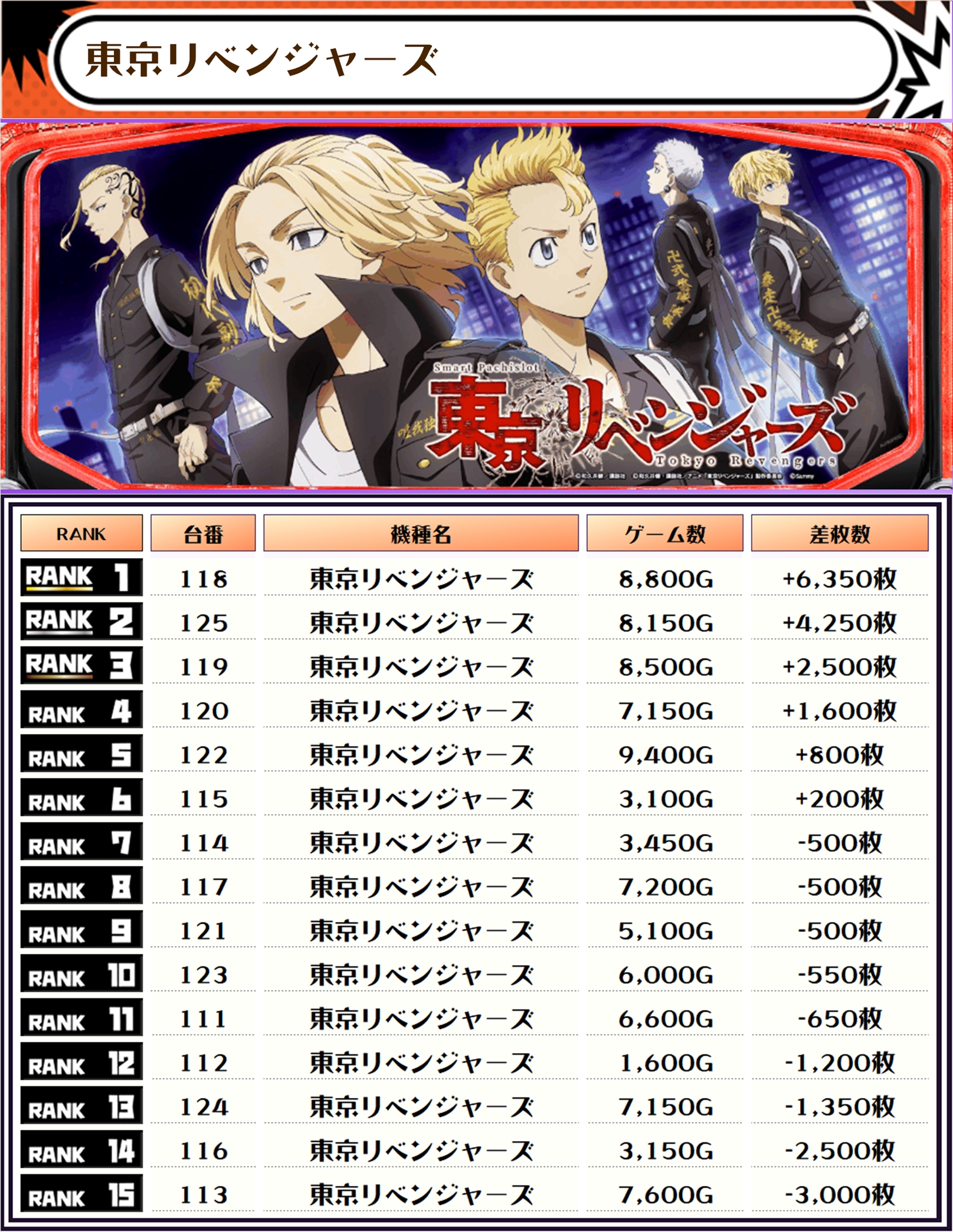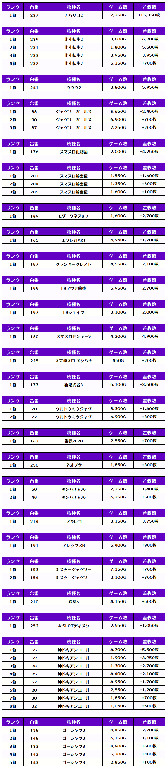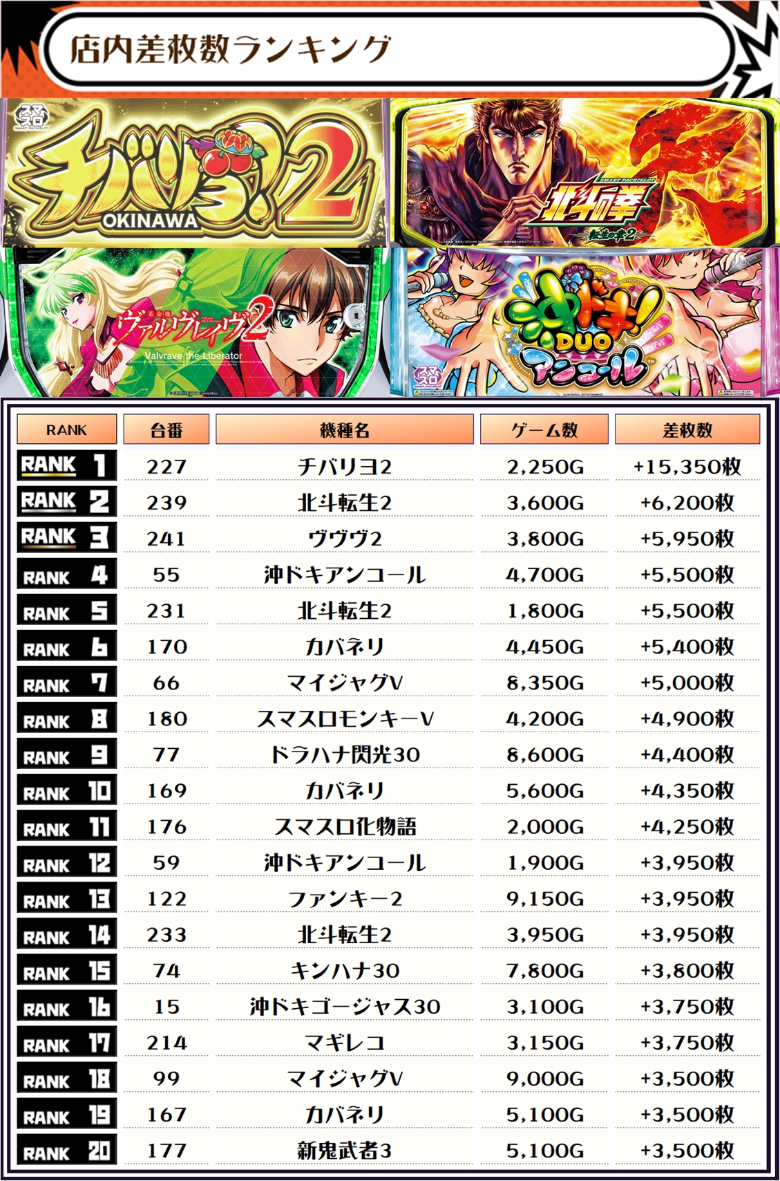 差枚ランキングでTOPに輝いたのは【チバリヨ2・227番台】で+15,350枚‼️