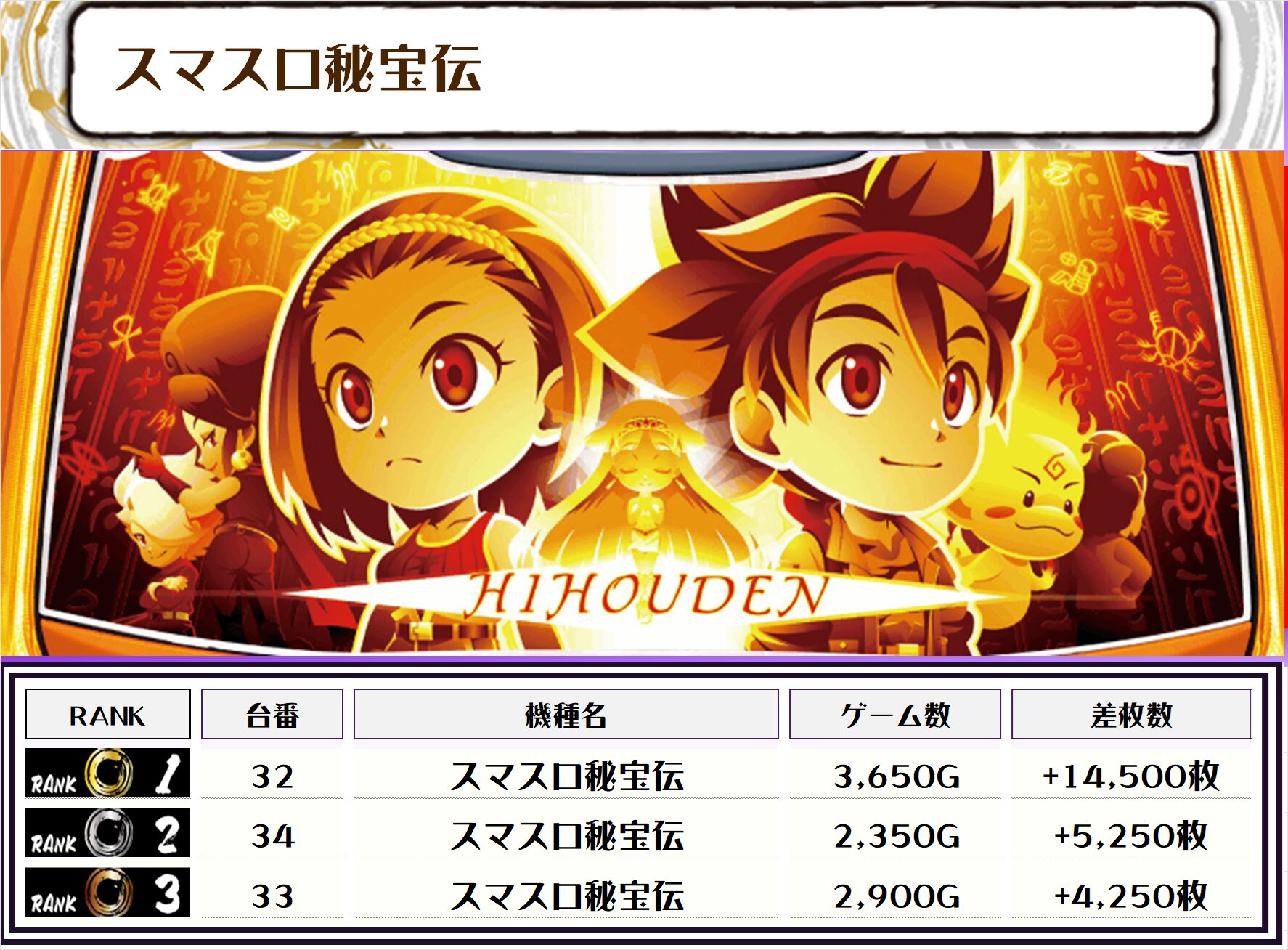 差枚ランキングでTOPに輝いたのは【スマスロ秘宝伝・32番台】で+14,500枚‼️