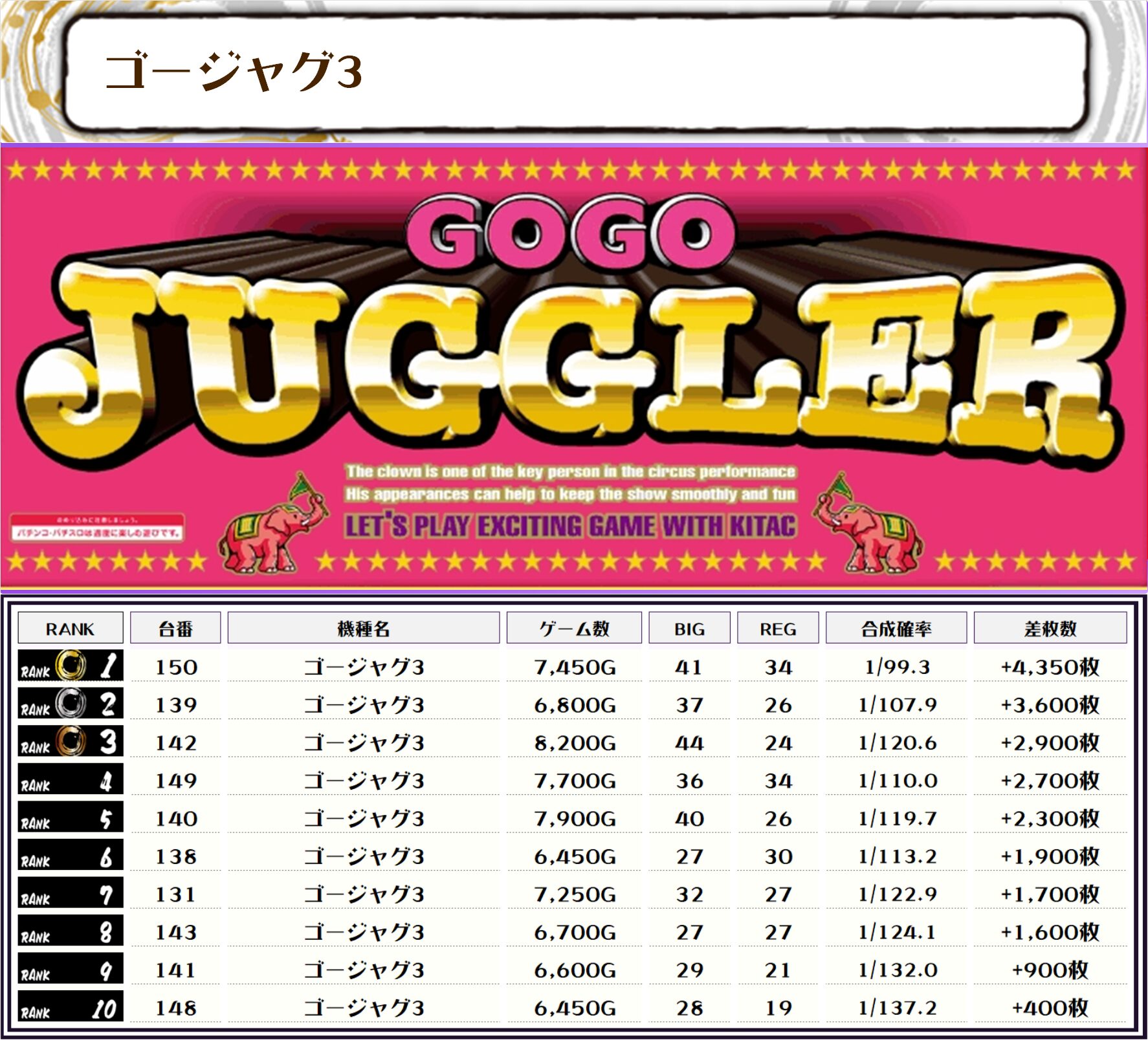 また、ゴージャグ3にも挙動のいい台が多く、差枚がマイナスの台もあと少しでプラス…という台が多数でした🔎