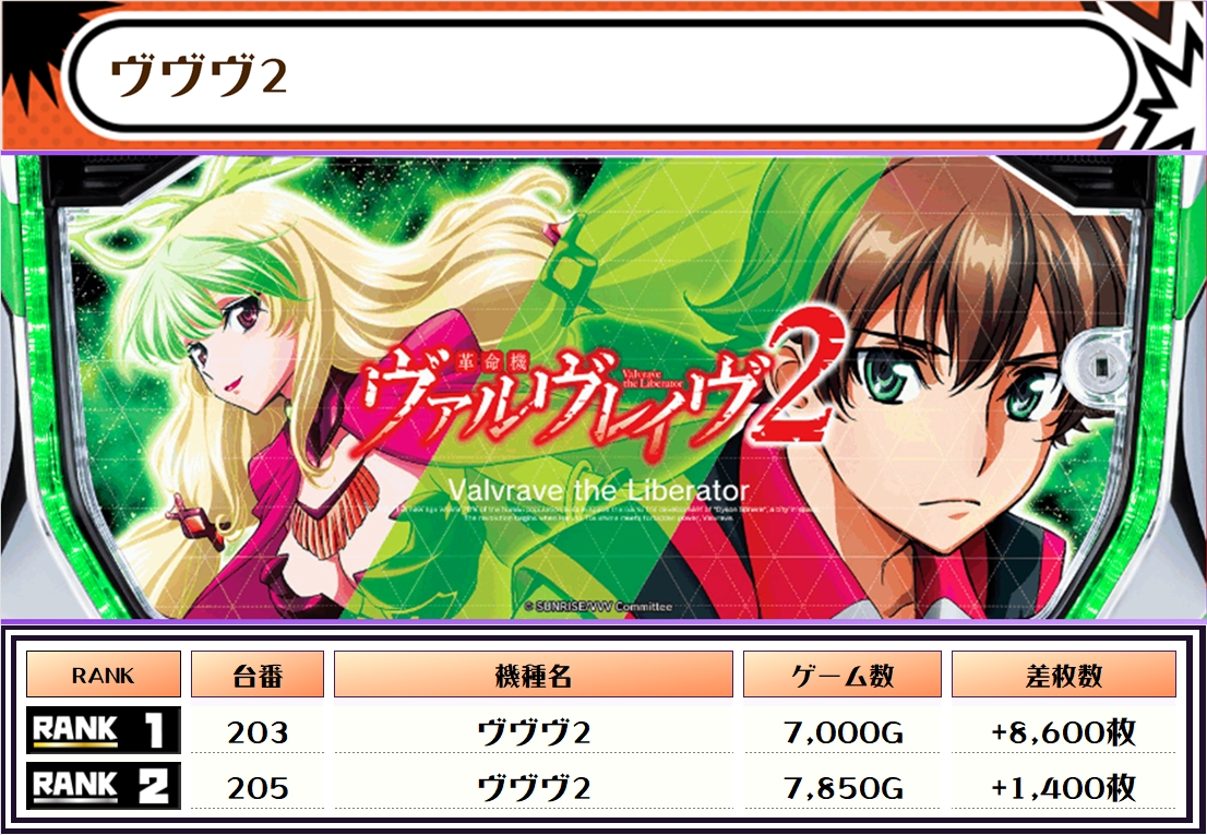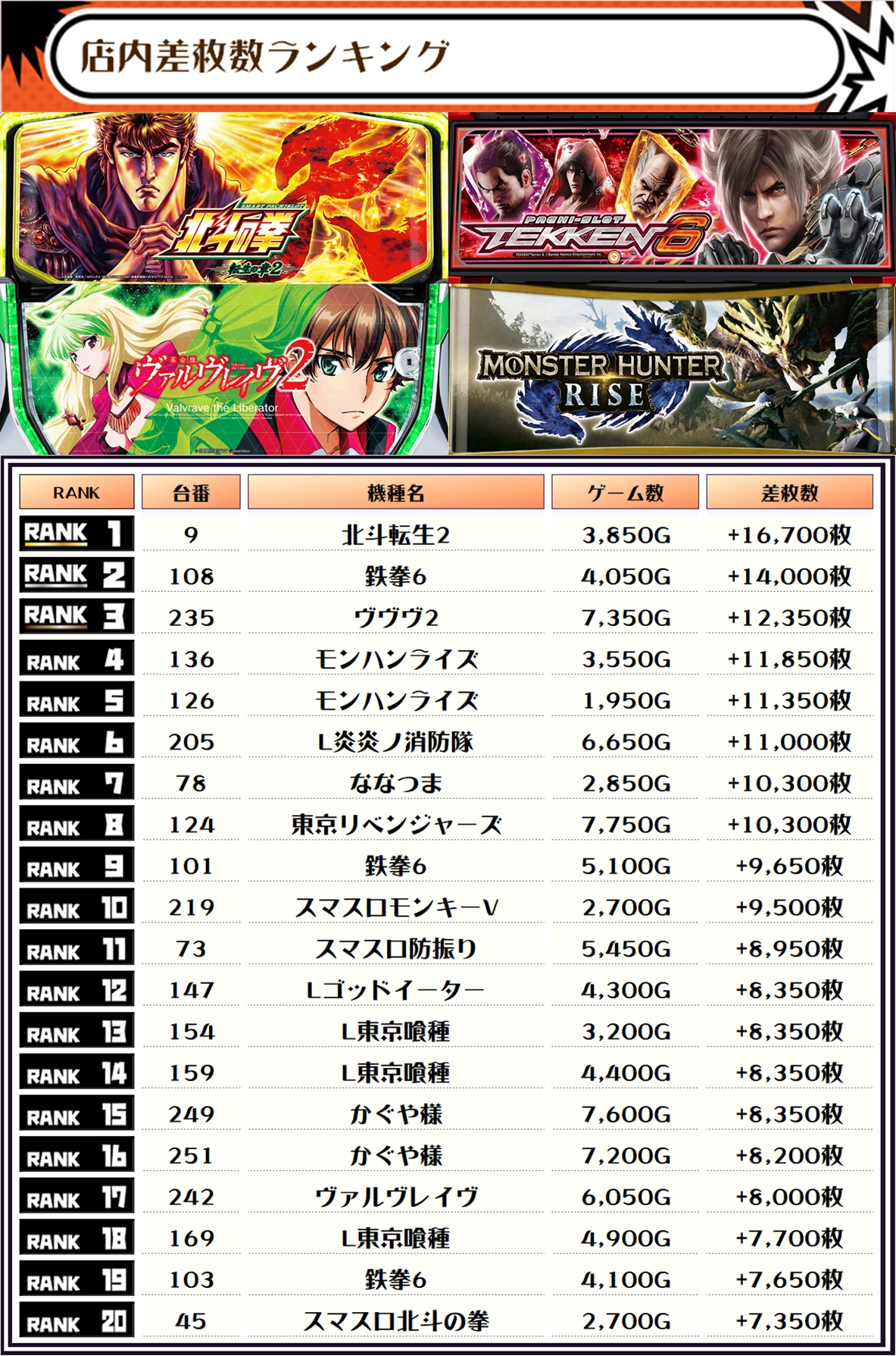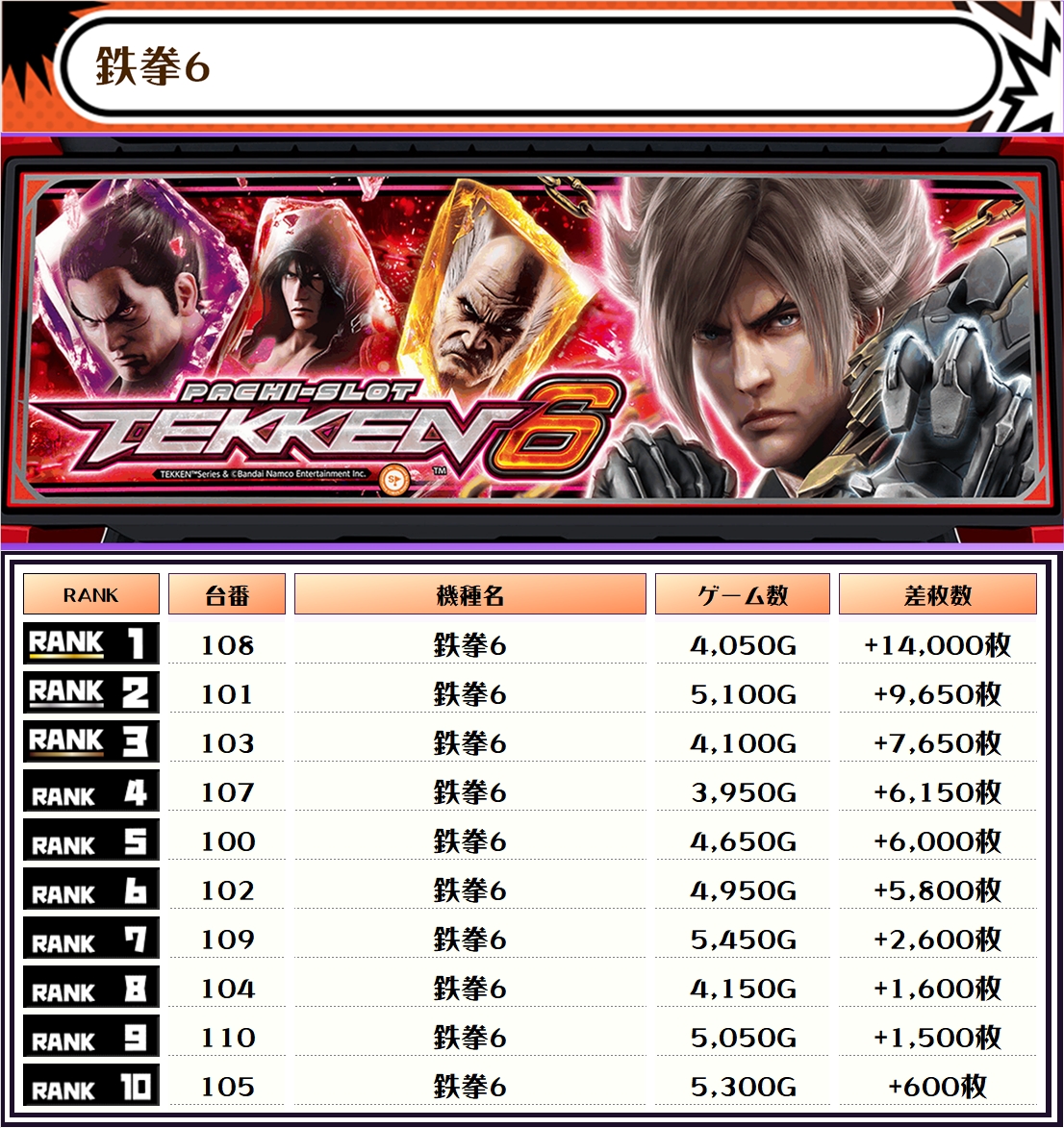 2位には【鉄拳6・108番台】の+14,000枚、そして3位には【ヴヴヴ2・235番台】の+12,350枚がランクインしましたっ👾👾👾