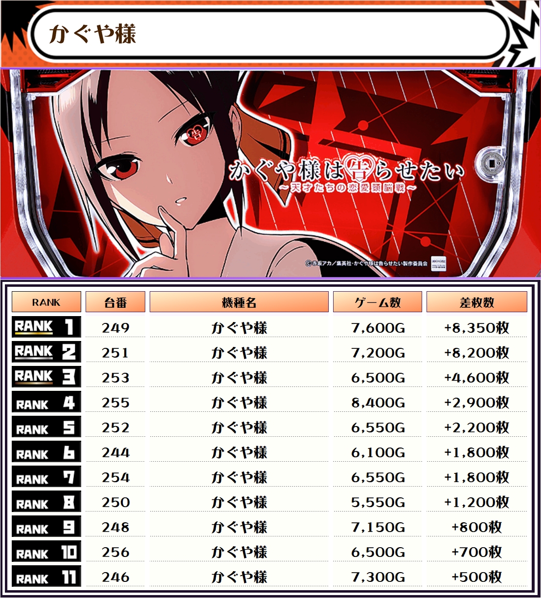 そして、ランキングは全て7000枚オーバー(大半は8000超え)で埋め尽くされる…という、とんでもない出玉を見せつけてくれましたね💪