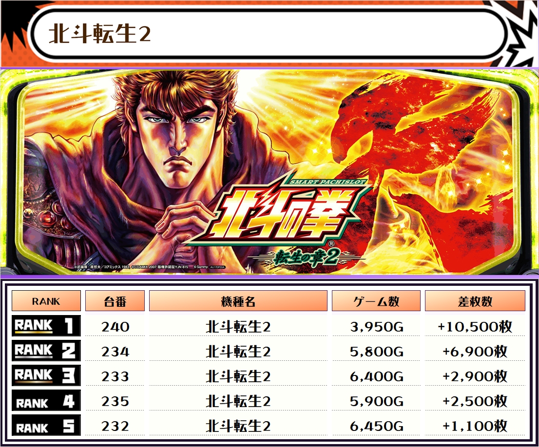 差枚ランキングでTOPに輝いたのは【北斗転生2・9番台】で+16,700枚‼️
