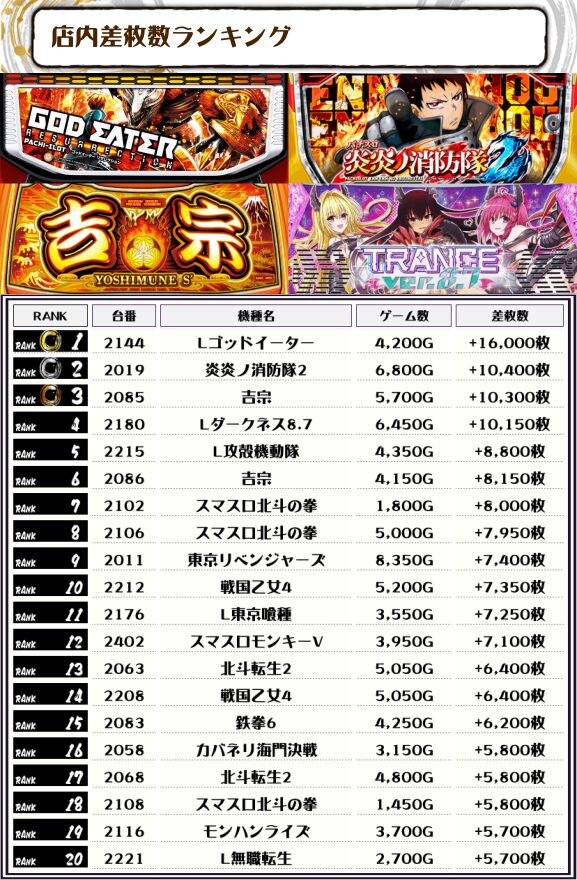 2位には【炎炎ノ消防隊2・2019台】の+10,400枚、3位には【吉宗・2085番台】の+10,300枚がランクインっ🏆🏆🏆🏆