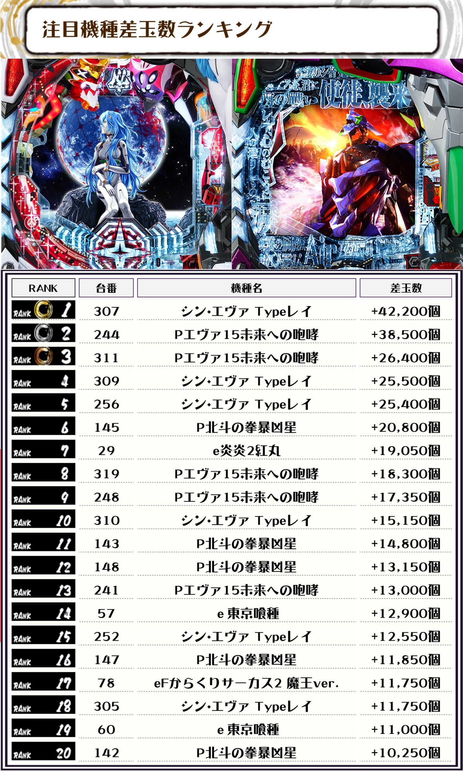 2位には【Pエヴァ15未来への咆哮・244番台】の+38,500発、また3位にも【Pエヴァ15未来への咆哮・311番台】の+26,400発がランクインしましたっ🏆