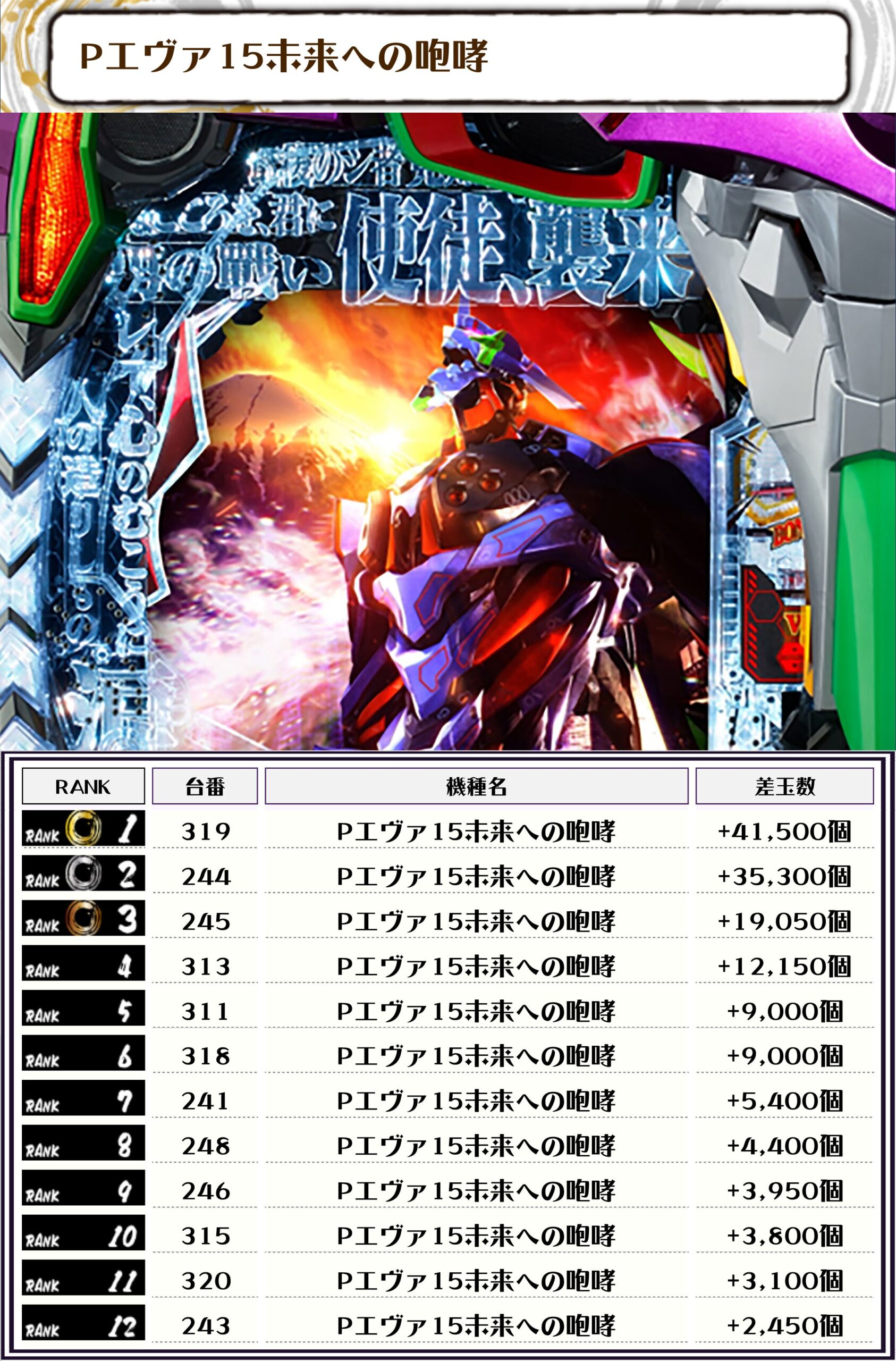 差玉トップに輝いたのは【Pエヴァ15未来への咆哮・319 番台】の+41,500発‼️