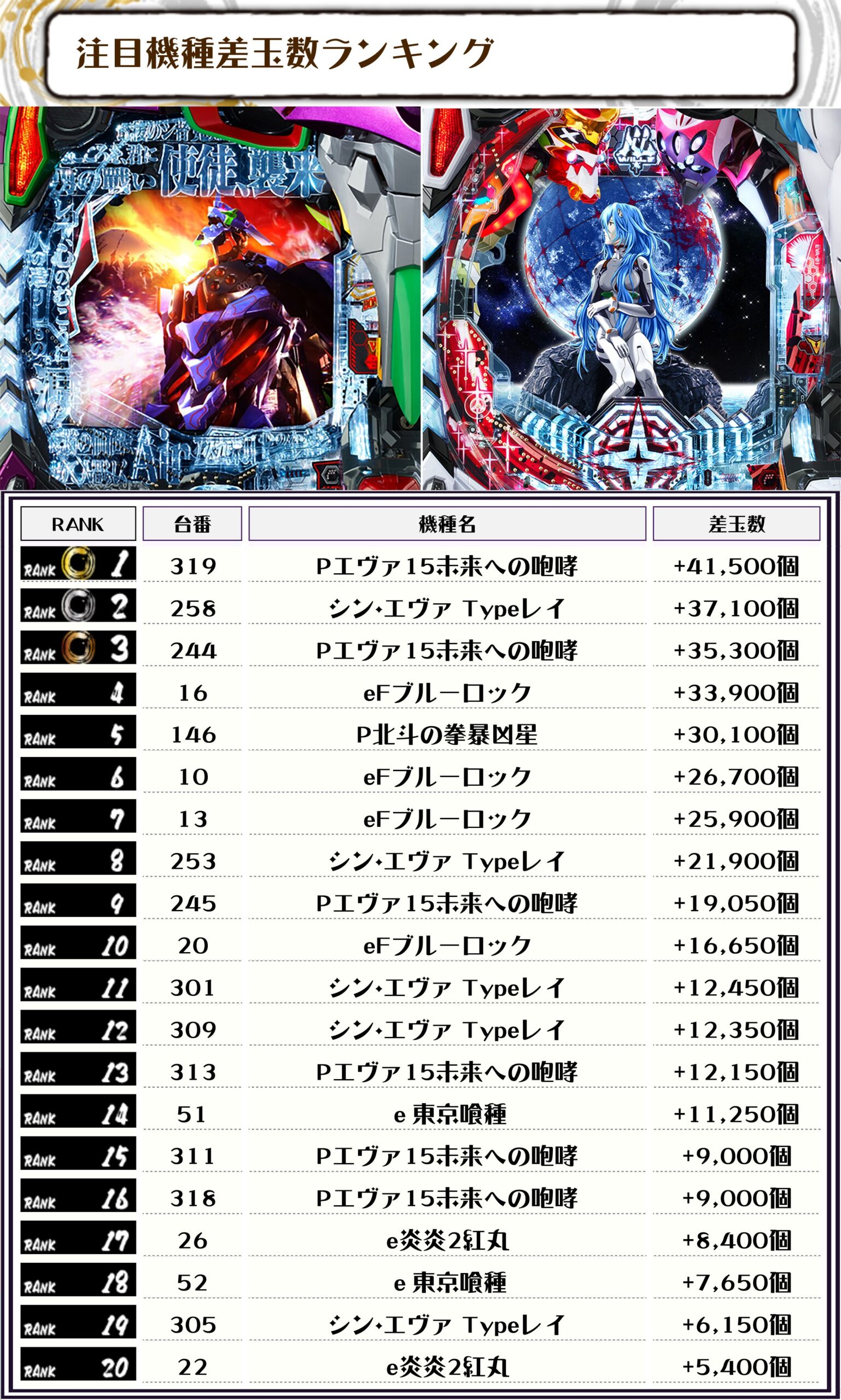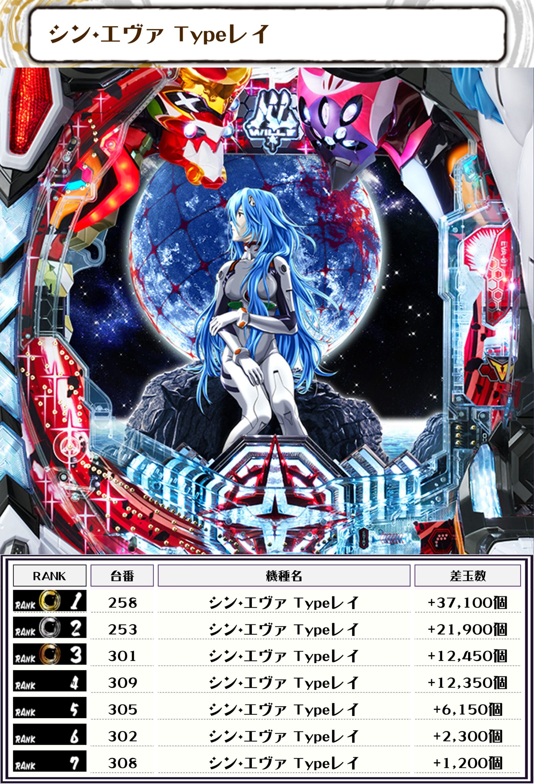 2位には【シン・エヴァ Typeレイ・258番台】の+37,100発、また3位には【Pエヴァ15未来への咆哮・244番台】の+35,300発がランクインしましたっ🏆