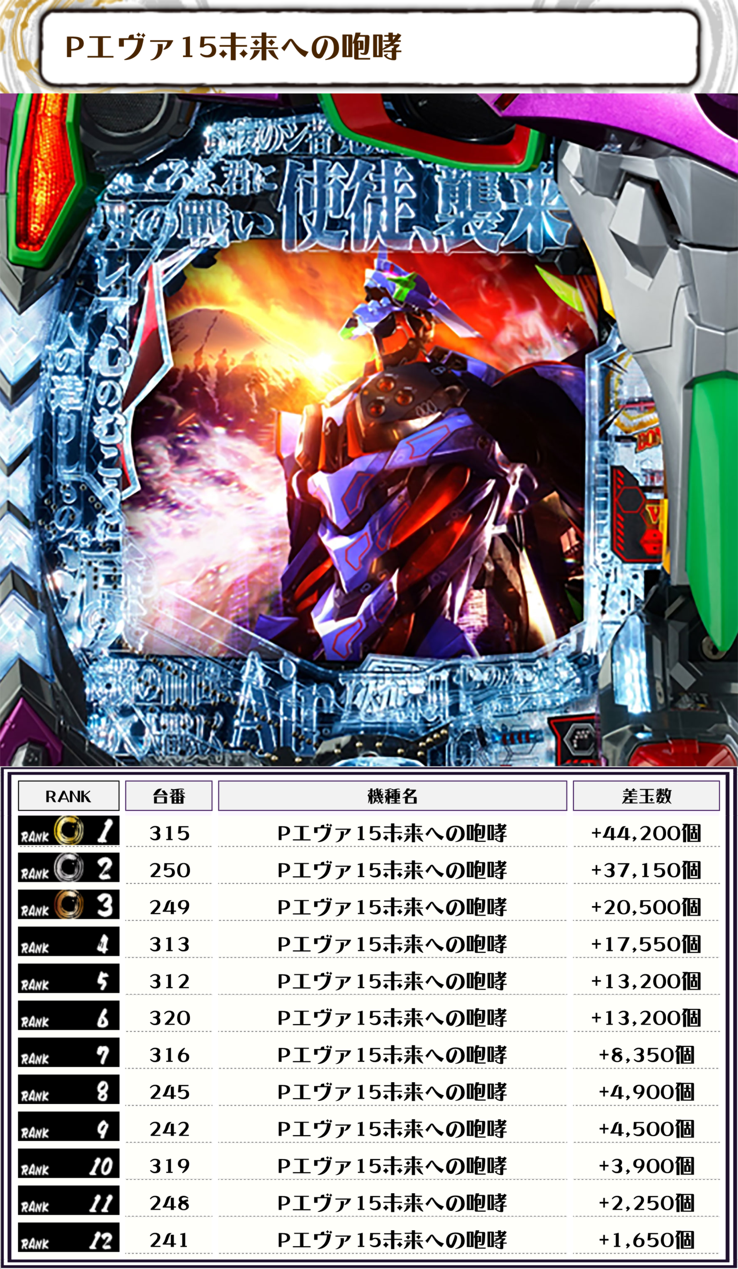 本日のTOPに輝いたのは【Pエヴァ15未来への咆哮・315番台】で+44,200発👍
