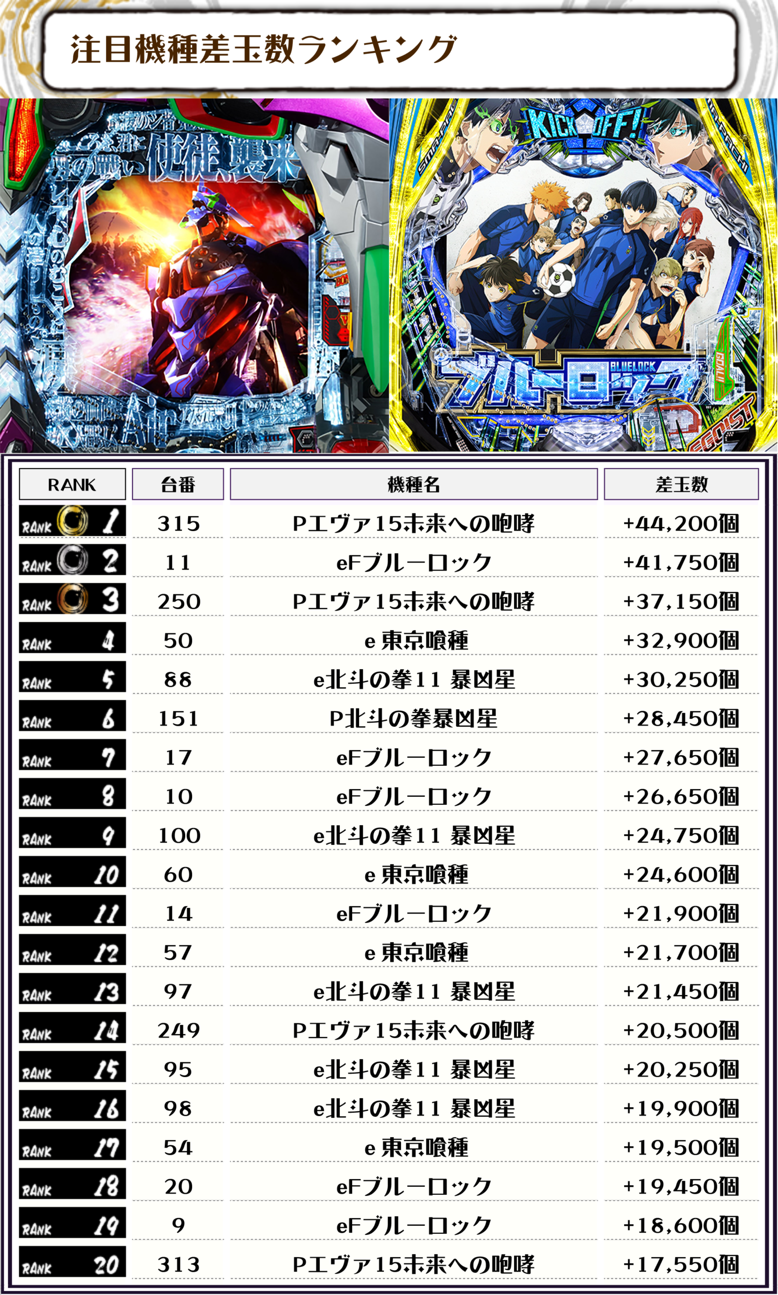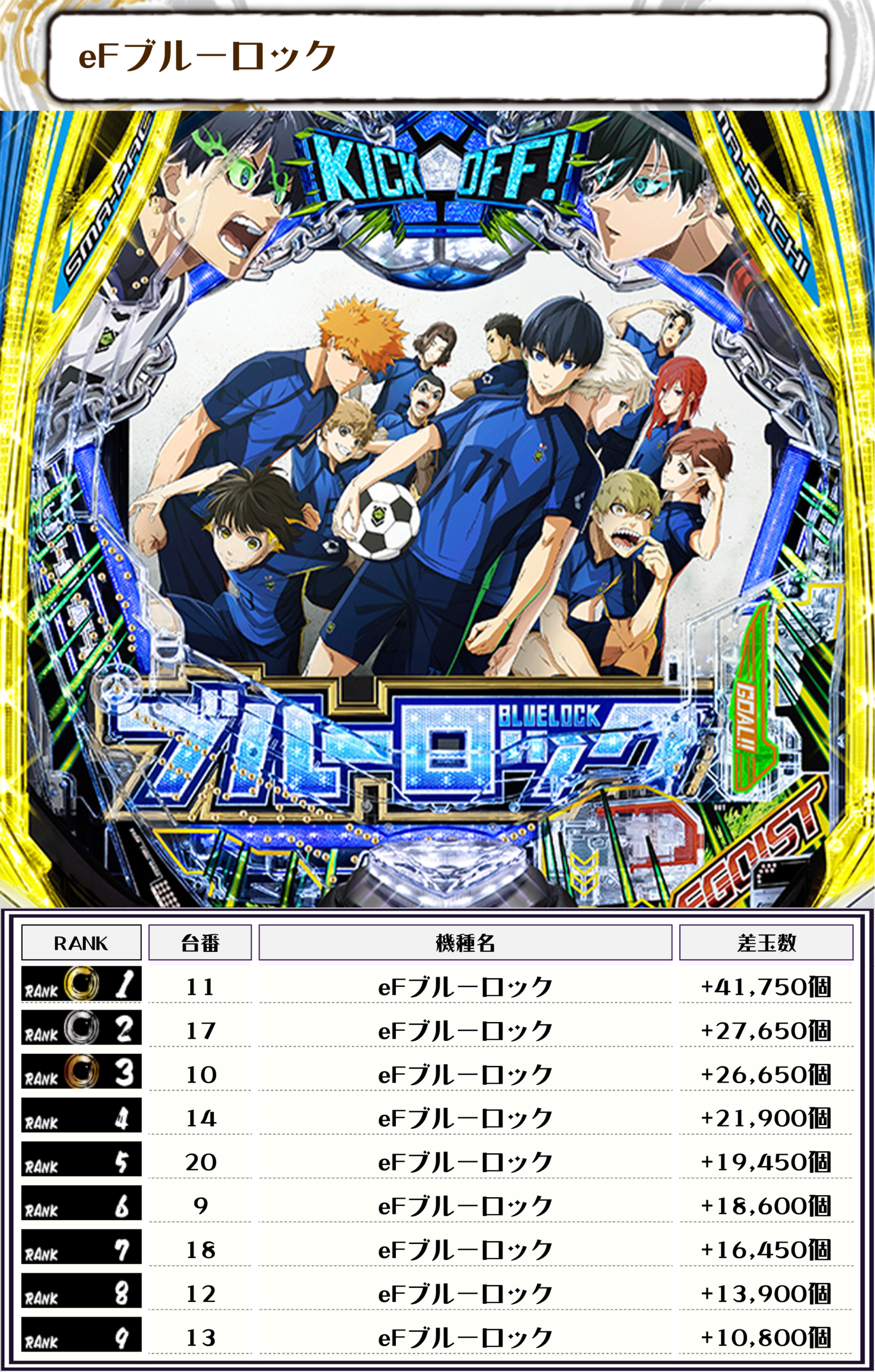 続く2位は【eFブルーロック・11番台】の+41,750発、そして3位には【Pエヴァ15未来への咆哮・250番台】の+37,150発がランクインしたぞっ💪