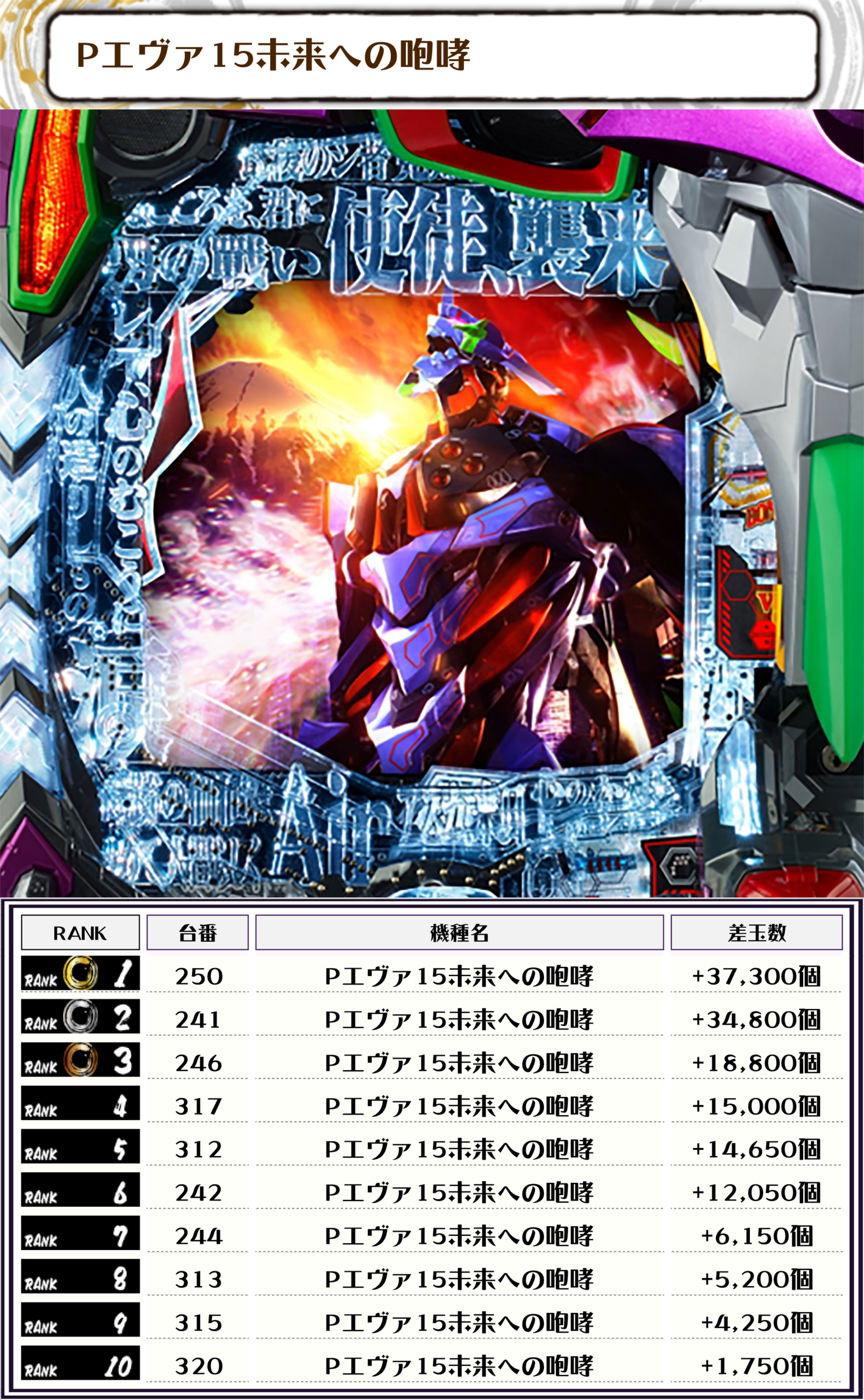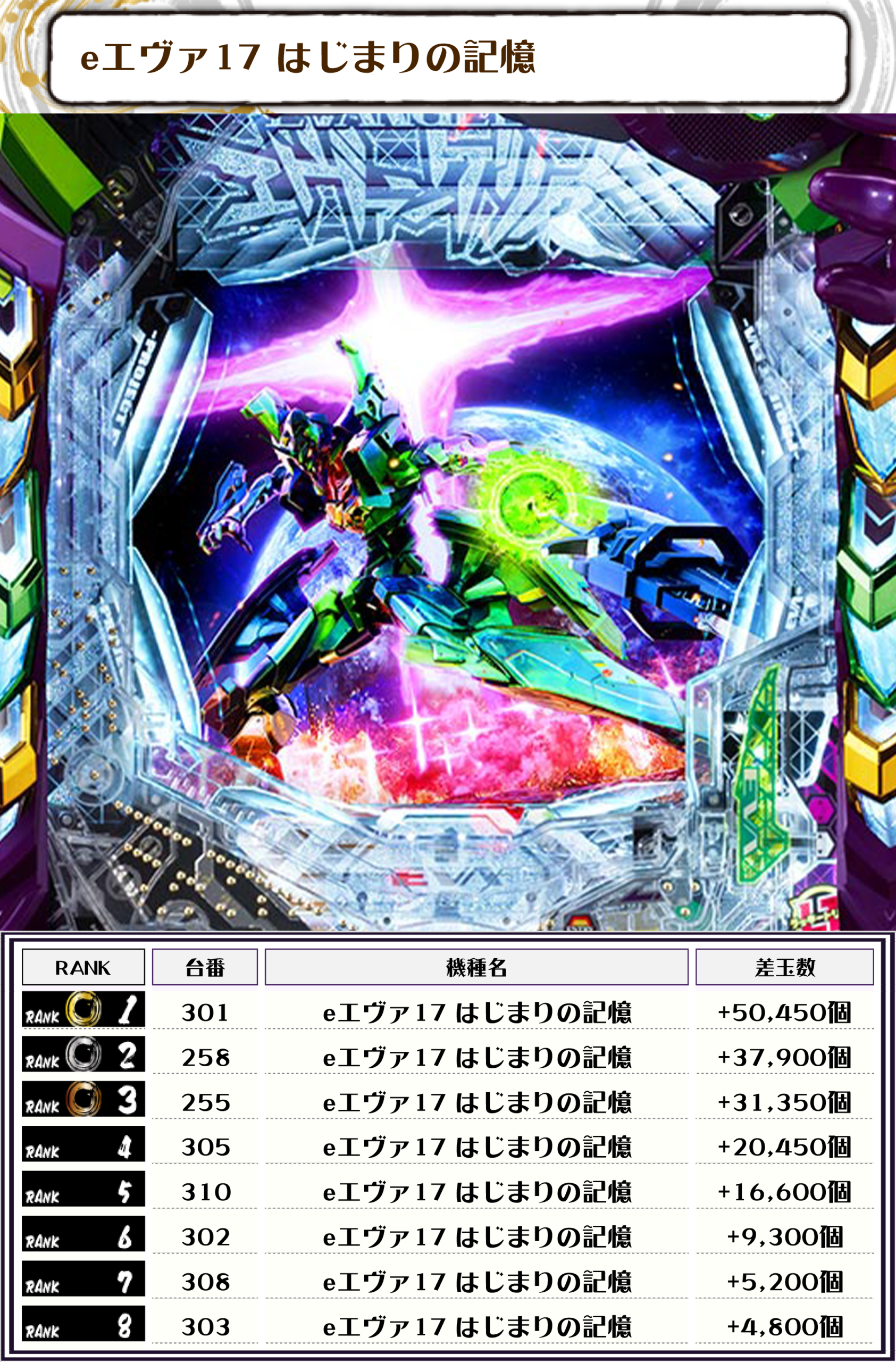 また2位には【eエヴァ17 はじまりの記憶・301番台】の+50,450発、そして3位も【eエヴァ17 はじまりの記憶・258番台】の+37,900発がランクインしましたっ🏆