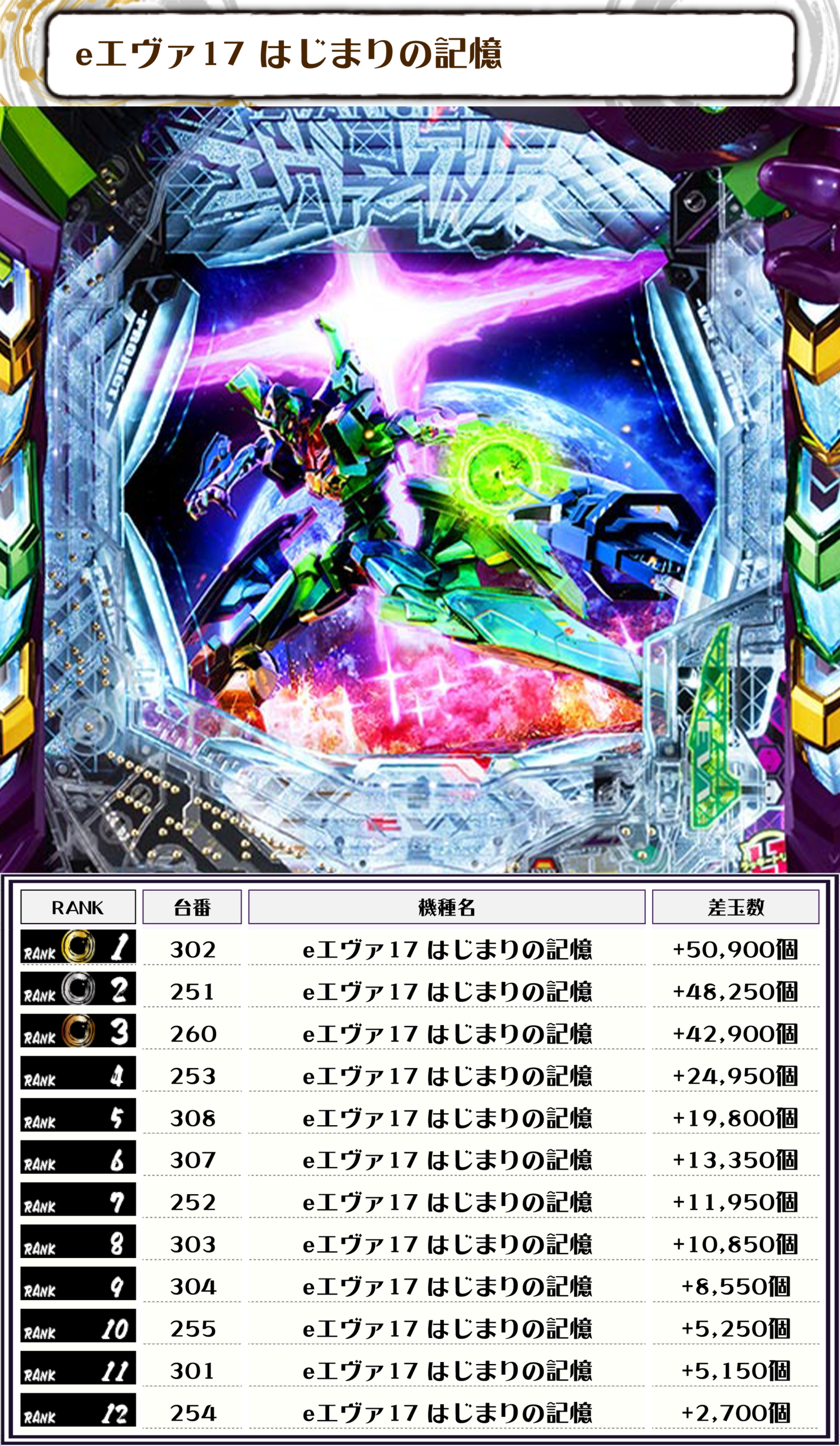 また2位にも【eエヴァ17 はじまりの記憶・251番台】の+48,250発、そして3位も【eエヴァ17 はじまりの記憶・260番台】の+42,900発がランクインしましたっ🏆