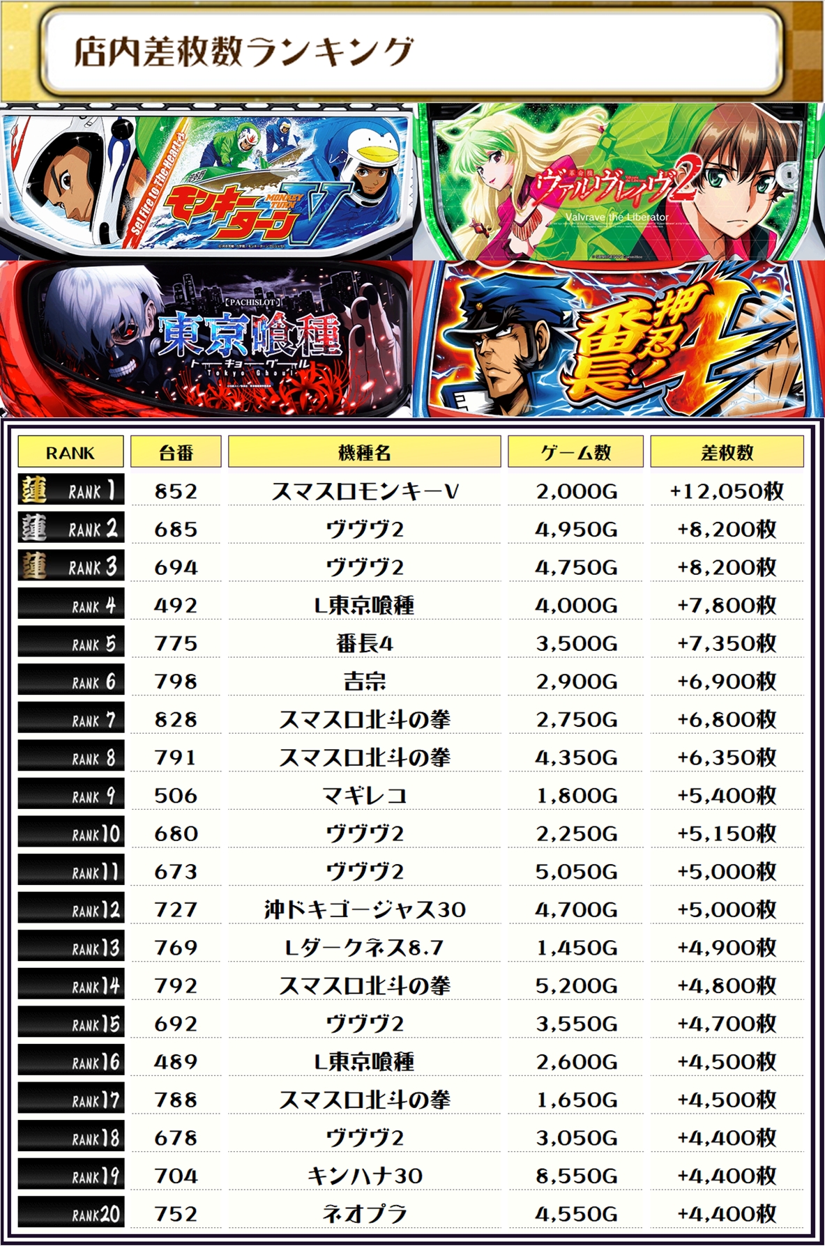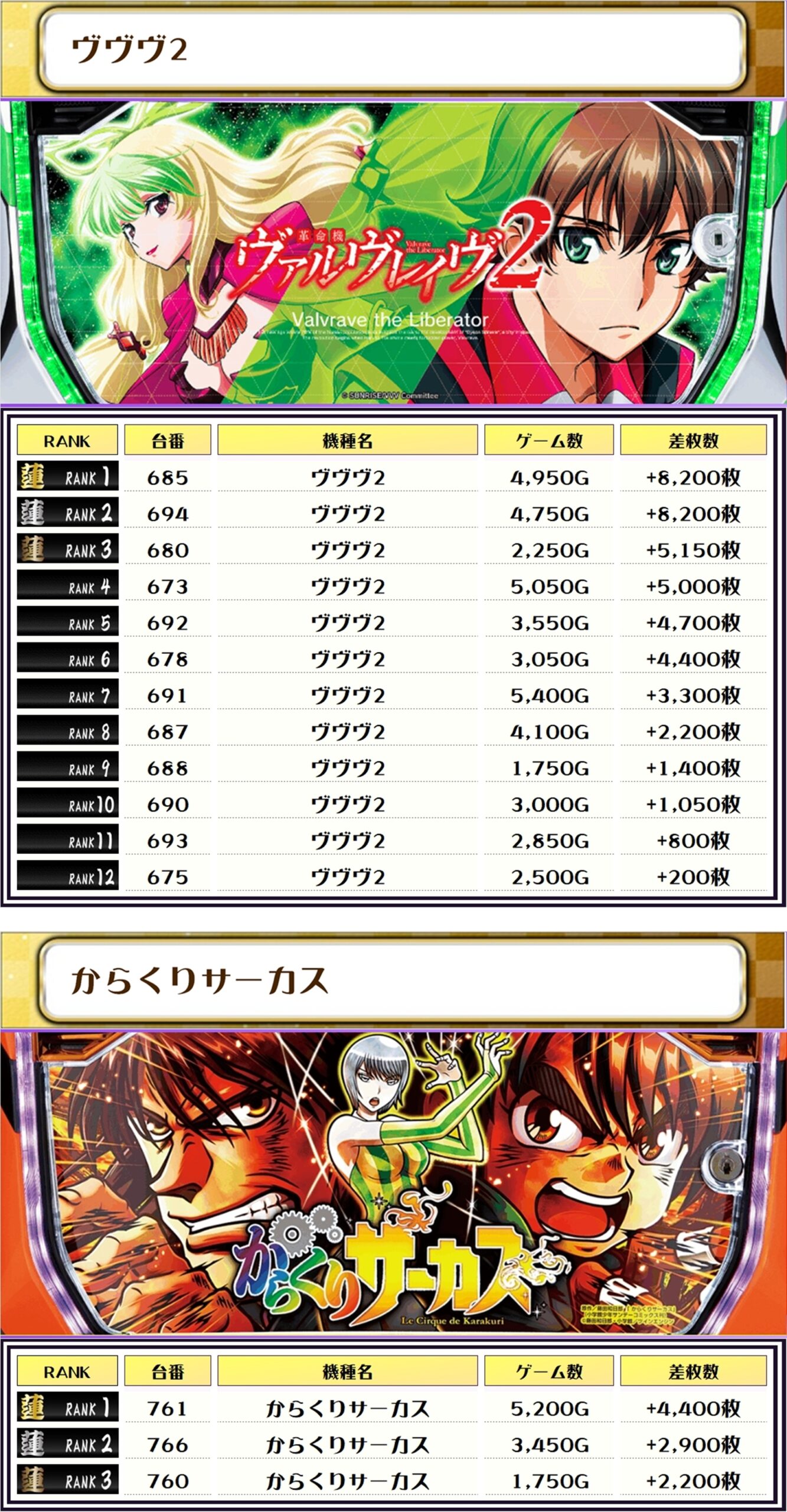 2位には【ヴヴヴ2・685番台】の+8,200枚、そして3位も同じ機種でしかもほぼ同じ枚数の【ヴヴヴ2・694番台】の+8,200枚がランクインですっ🏆🏆🏆🏆