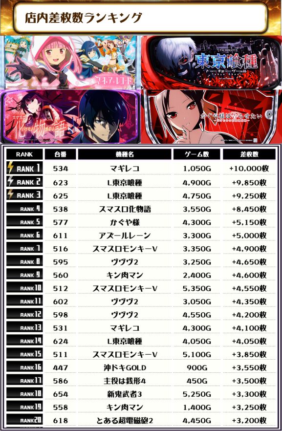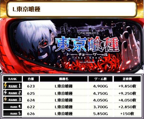 2位には【L東京喰種・608番台】の+9,850枚、3位にも同じく【L東京喰種・625番台】の+9,250枚がランクイン💥💥💥💥💥
