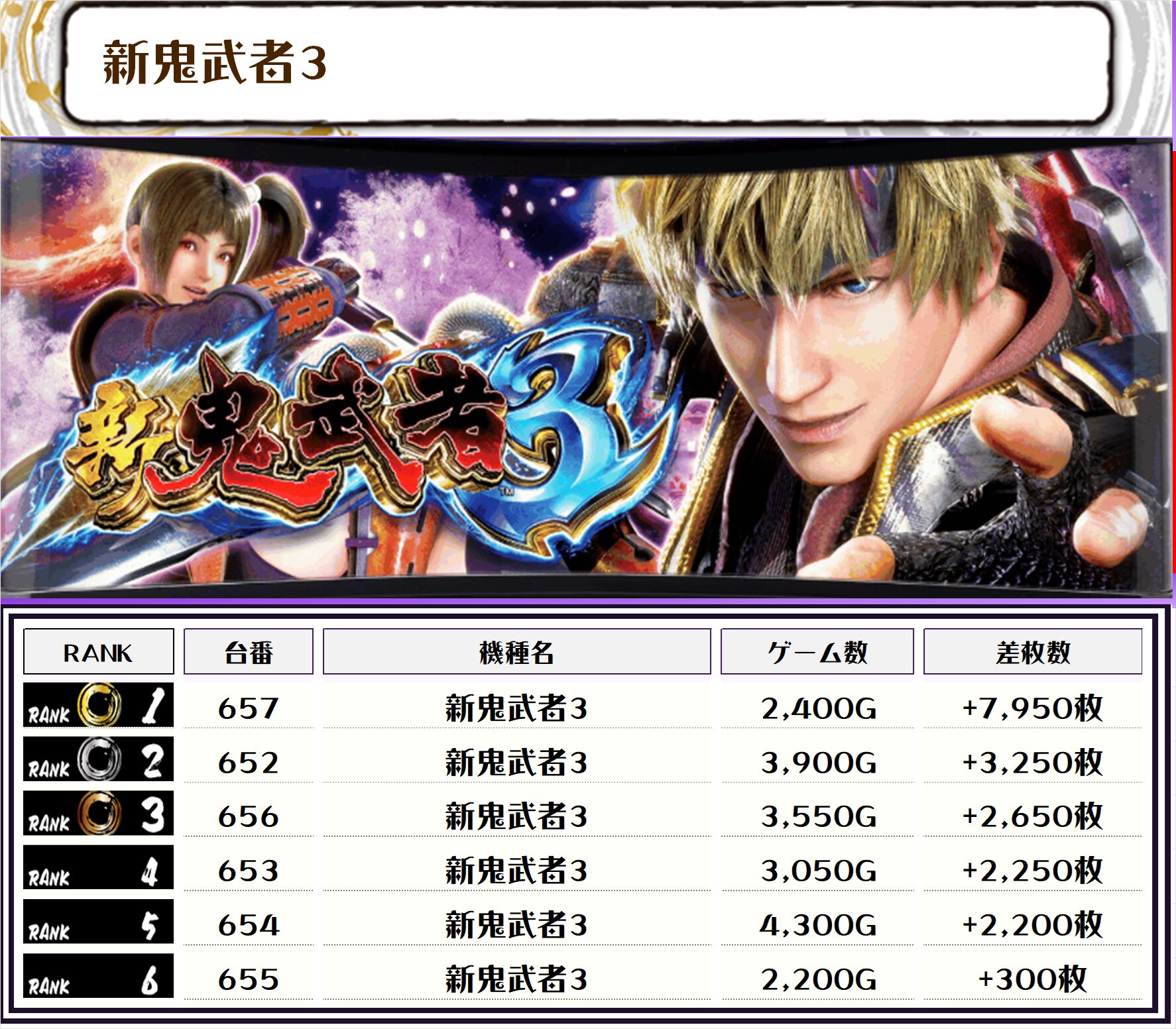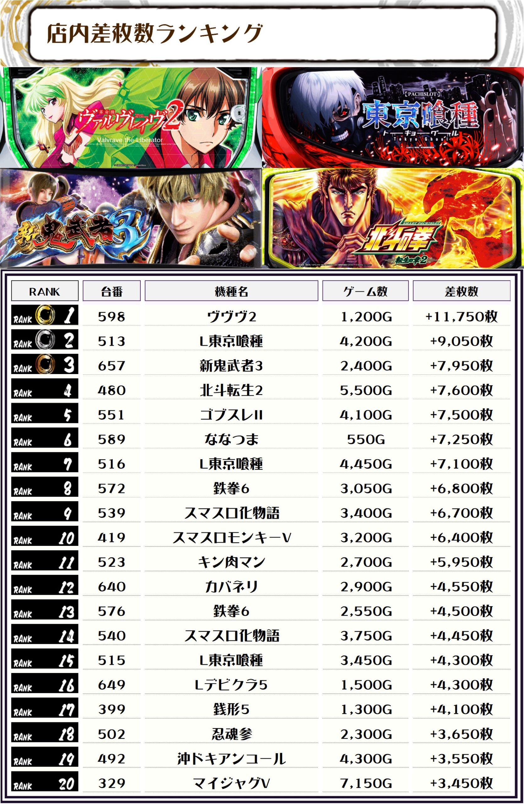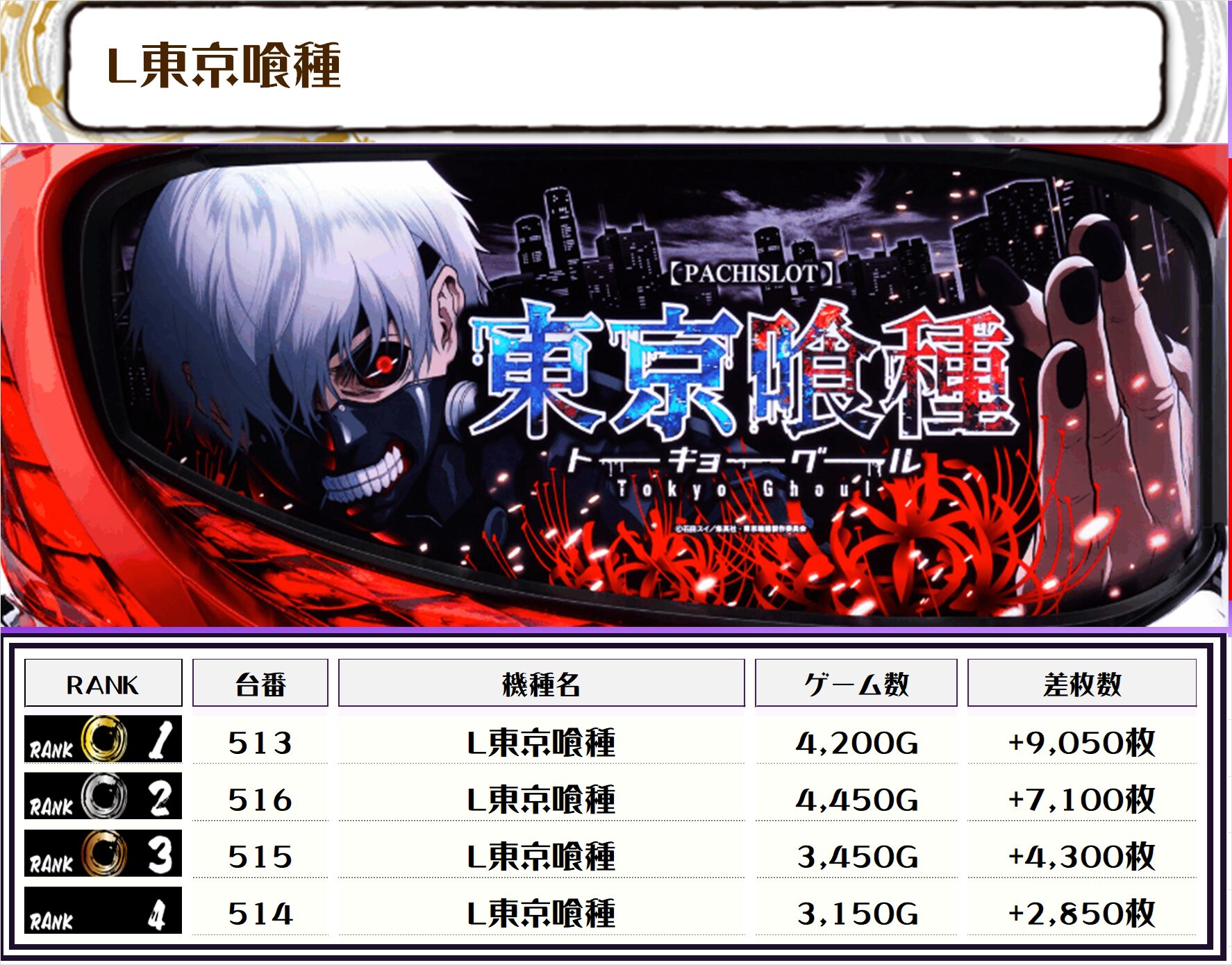 2位には【L東京喰種・513番台】の+9,050枚、そして3位には【新鬼武者3・657番台】の+7,950枚がランクインっ🏆🏆🏆🏆