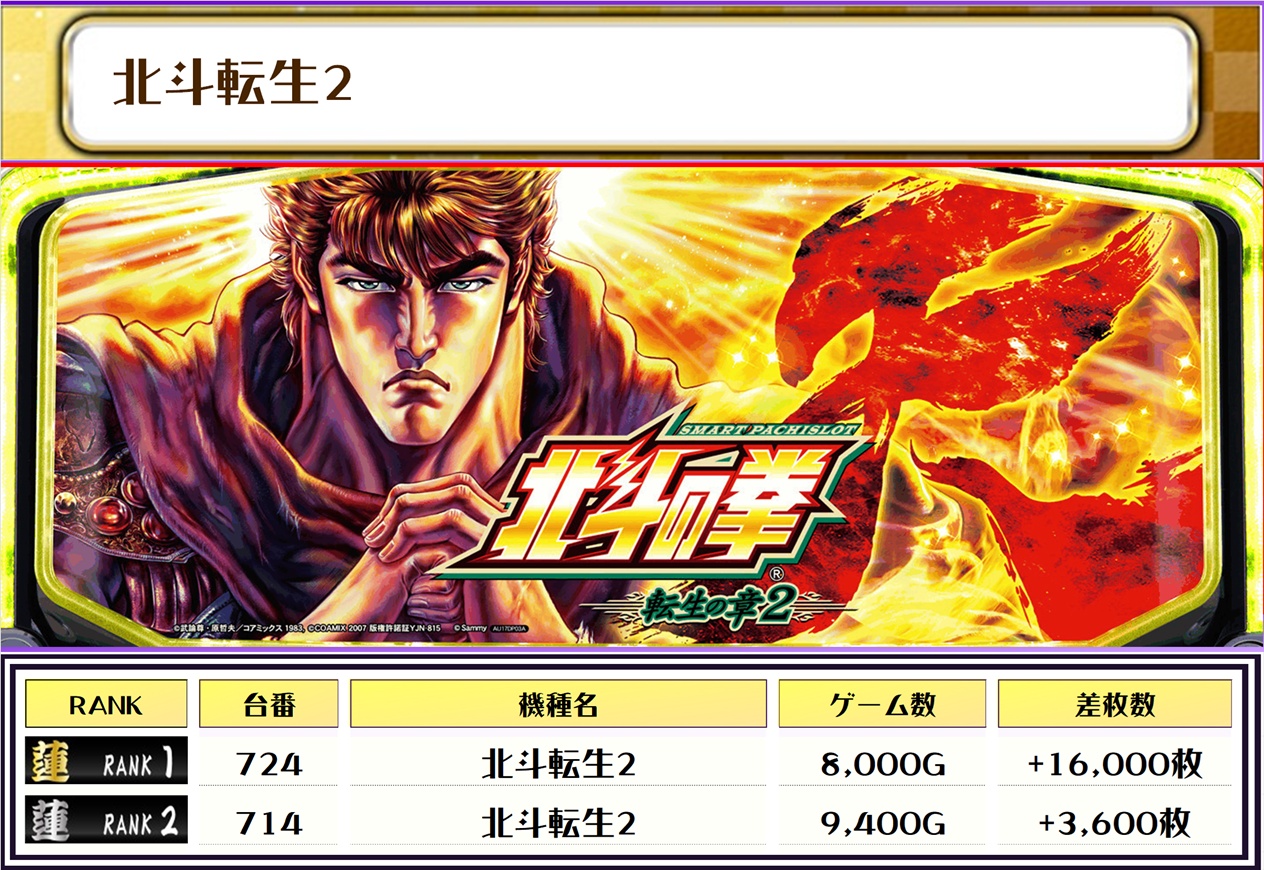 この日、全体の差枚トップに輝いたのは【北斗転生2・724番台】で+16,000枚‼️